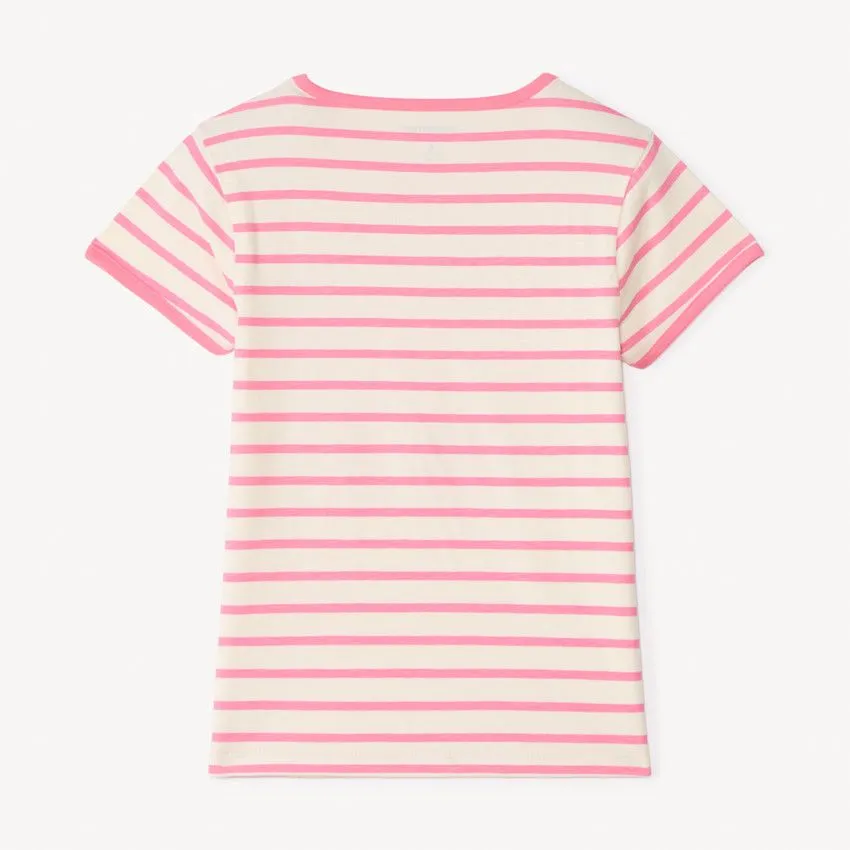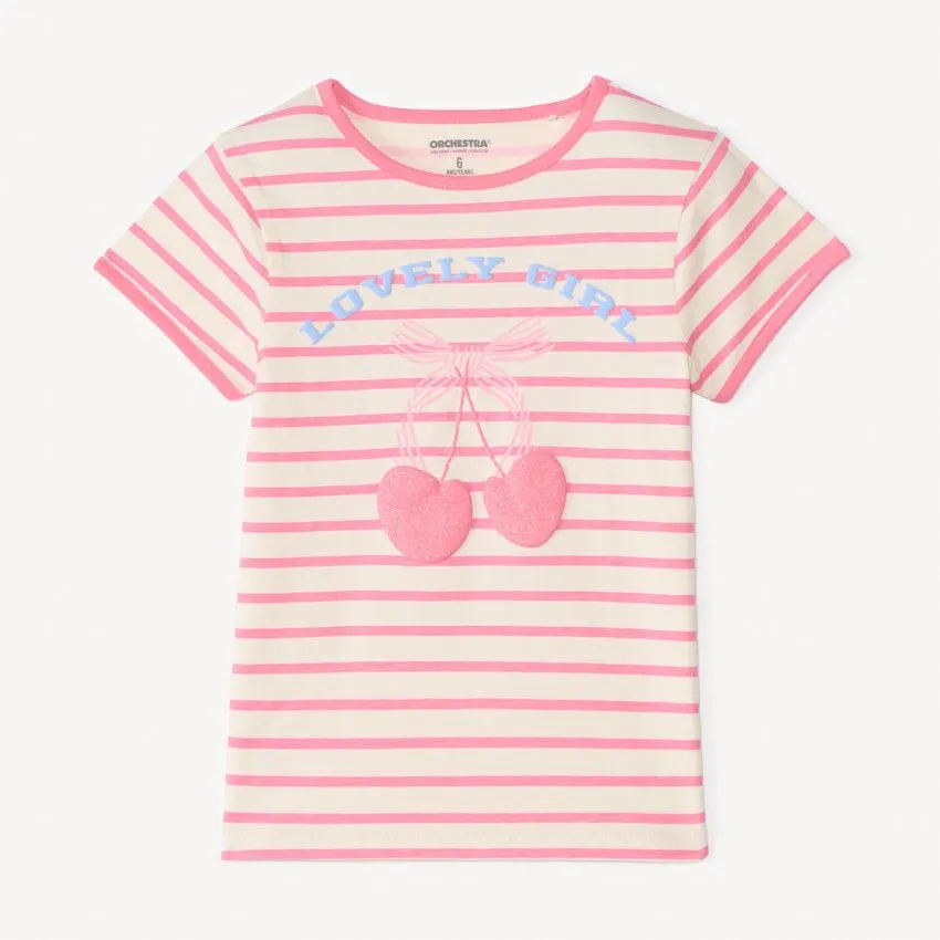 Футболка с коротким рукавом для девочки ORCHESTRA — яркая и стильная модель для повседневных образов. Выполнена из мягкого и дышащего материала (95% хлопок, 5% эластан), который обеспечивает комфорт и свободу движений. Футболка украшена принтом с блестящими вишнями и объёмной надписью, что придаёт модели оригинальность и игривый характер.