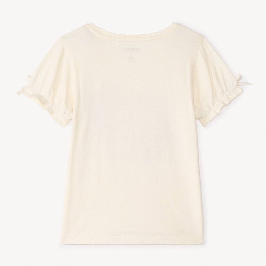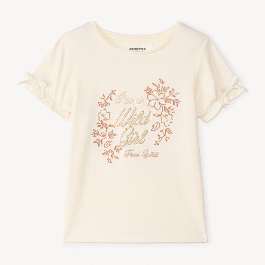 Футболка с коротким рукавом для девочки ORCHESTRA — стильная и комфортная модель для повседневных образов. Выполнена из мягкого и дышащего материала (96% хлопок, 4% эластан), который обеспечивает удобную посадку и свободу движений. Модель украшена вышивкой по центру, а завязки на рукавах придают футболке оригинальный и модный акцент.