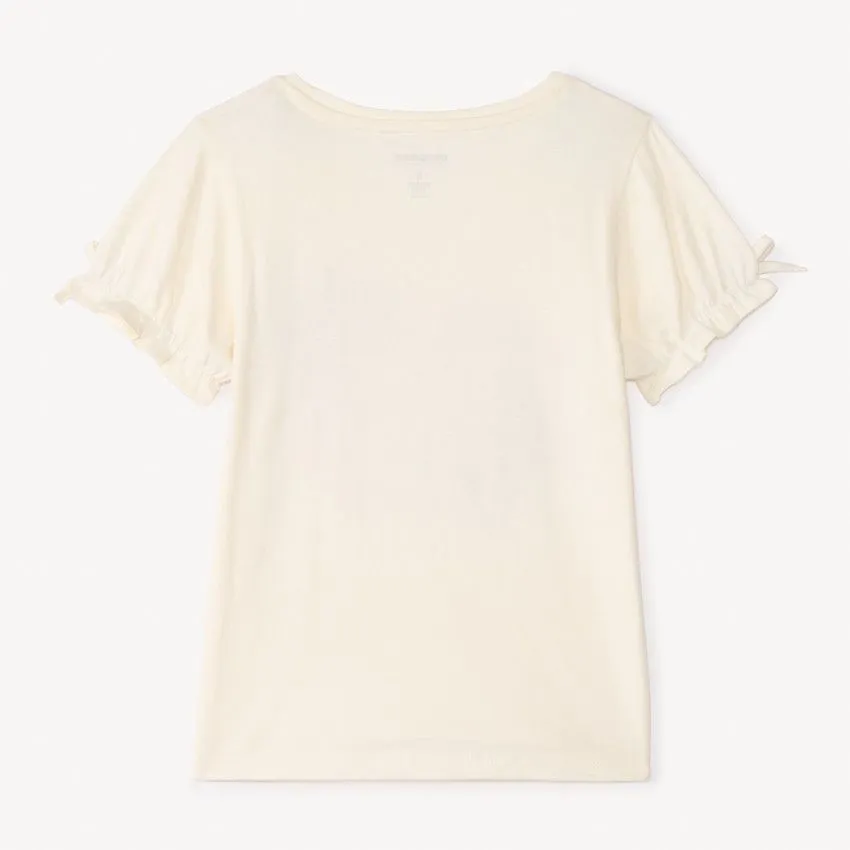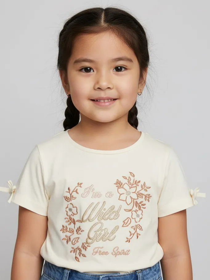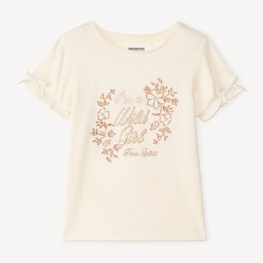 Футболка с коротким рукавом для девочки ORCHESTRA — стильная и комфортная модель для повседневных образов. Выполнена из мягкого и дышащего материала (96% хлопок, 4% эластан), который обеспечивает удобную посадку и свободу движений. Модель украшена вышивкой по центру, а завязки на рукавах придают футболке оригинальный и модный акцент.