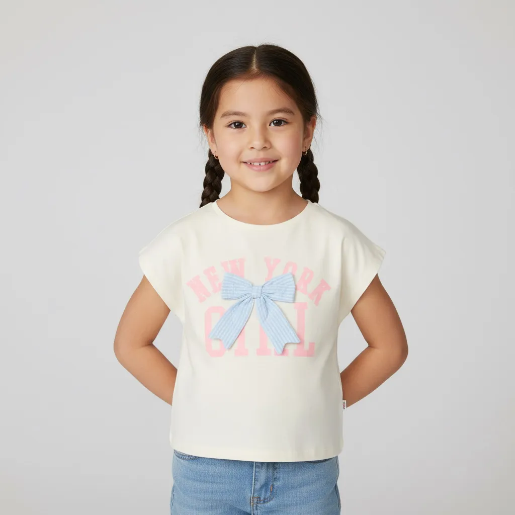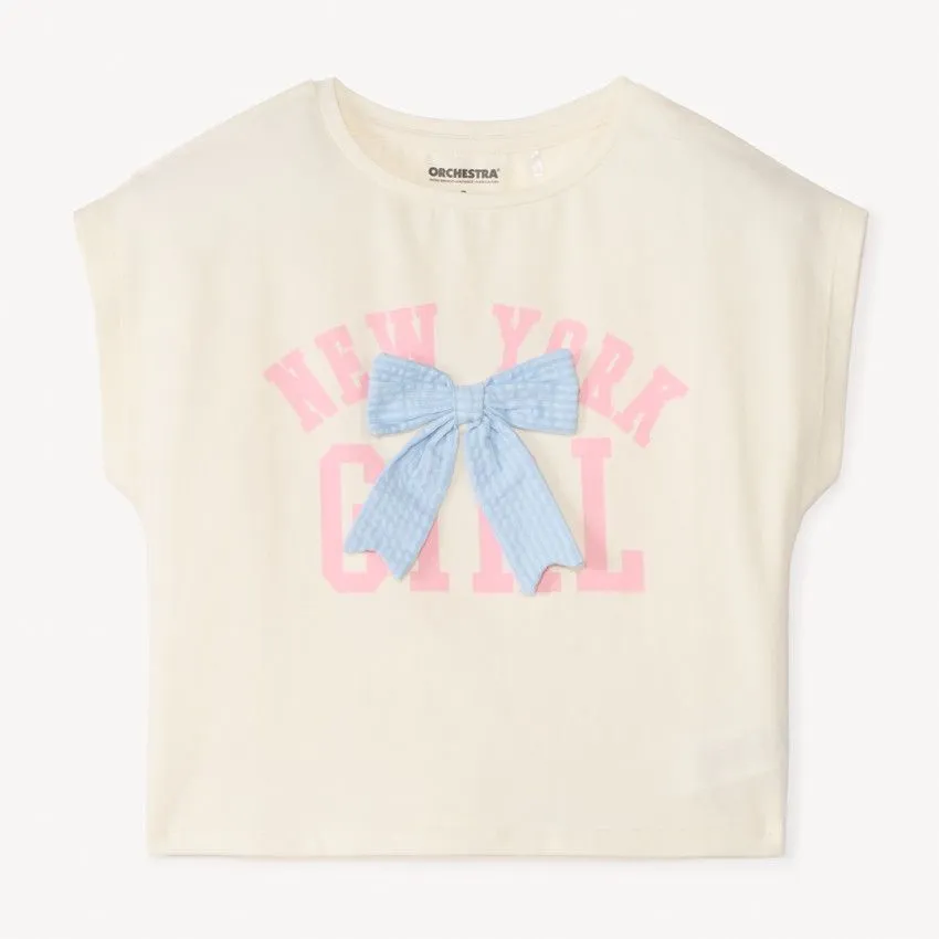 Футболка с коротким рукавом для девочки ORCHESTRA — удобная и стильная модель для повседневной носки. Выполнена из мягкого и дышащего материала (96% хлопок, 4% эластан), который обеспечивает комфорт и свободу движений. Модель украшена аккуратным бантиком, вшитым по центру, придающим образу нежность и изящность.