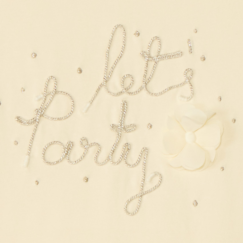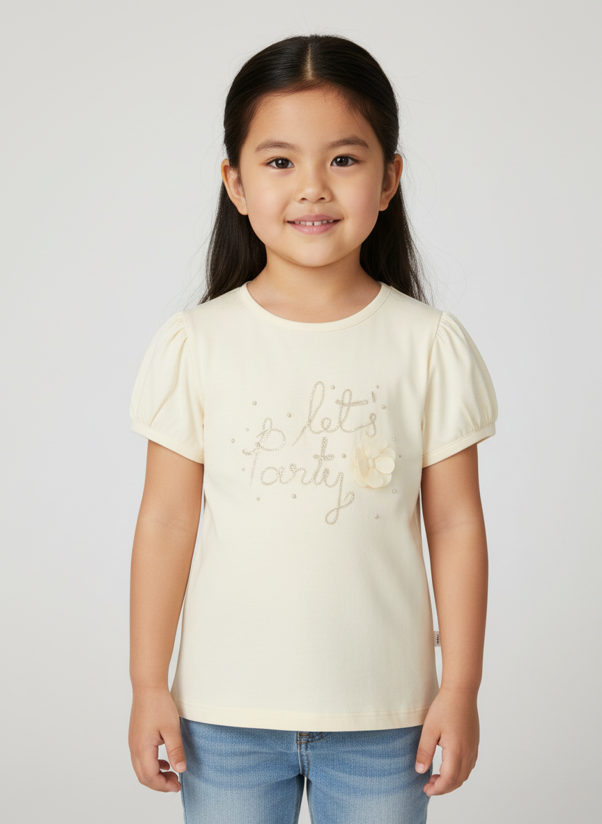 Футболка с коротким рукавом для девочки выполнена из мягкого и дышащего хлопка с добавлением эластана (95% хлопок, 5% эластан), что обеспечивает комфортную посадку и свободу движений. Модель украшена объемной 3D-надписью и декоративным цветочком по центру, а рукава-фонарики придают образу аккуратный и стильный вид. Идеально подходит для повседневной носки и летних прогулок.