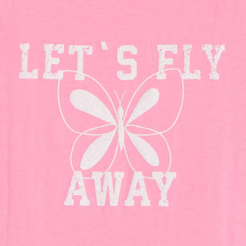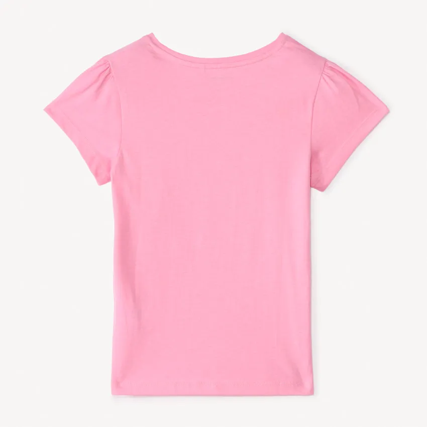 Сборки на плечах добавляют образу аккуратный и немного нарядный вид. Передняя часть украшена весёлым принтом с блестящими элементами, который делает футболку более выразительной.