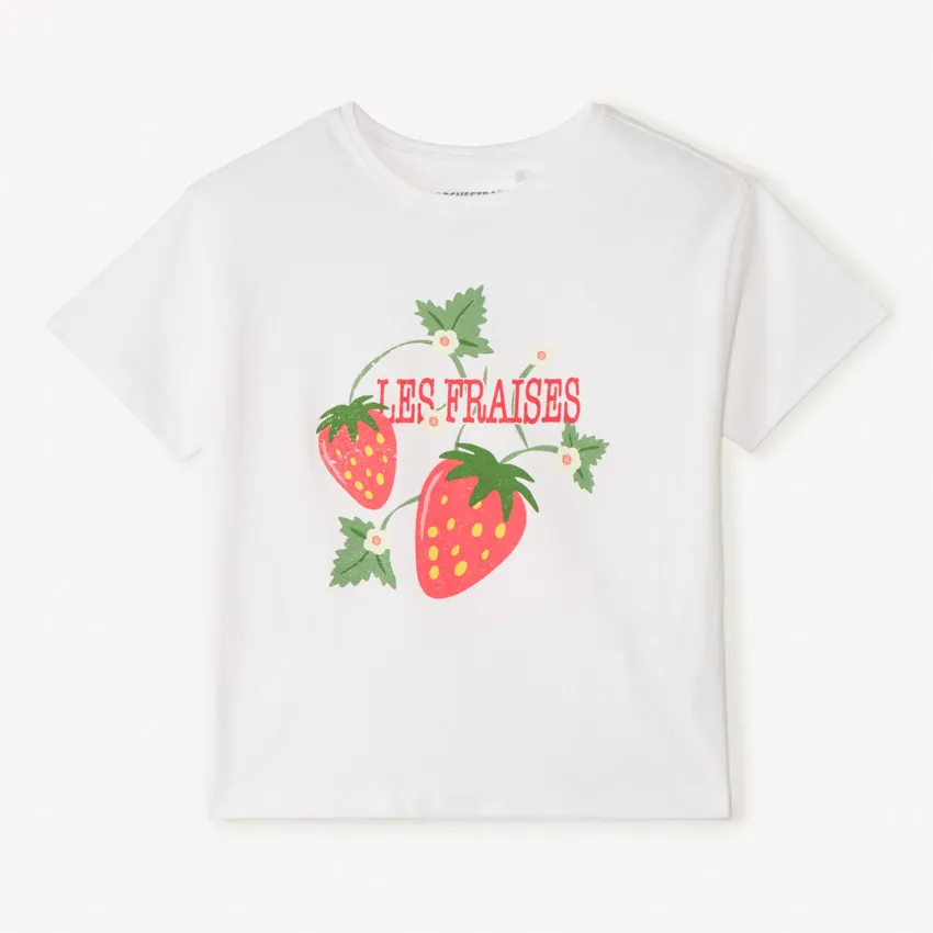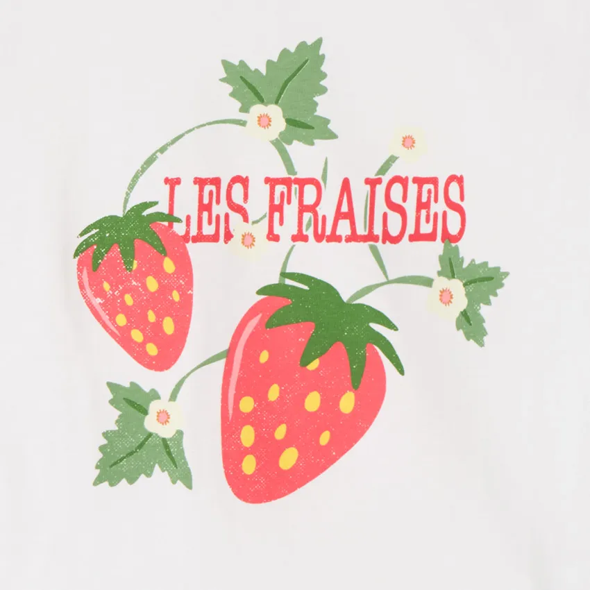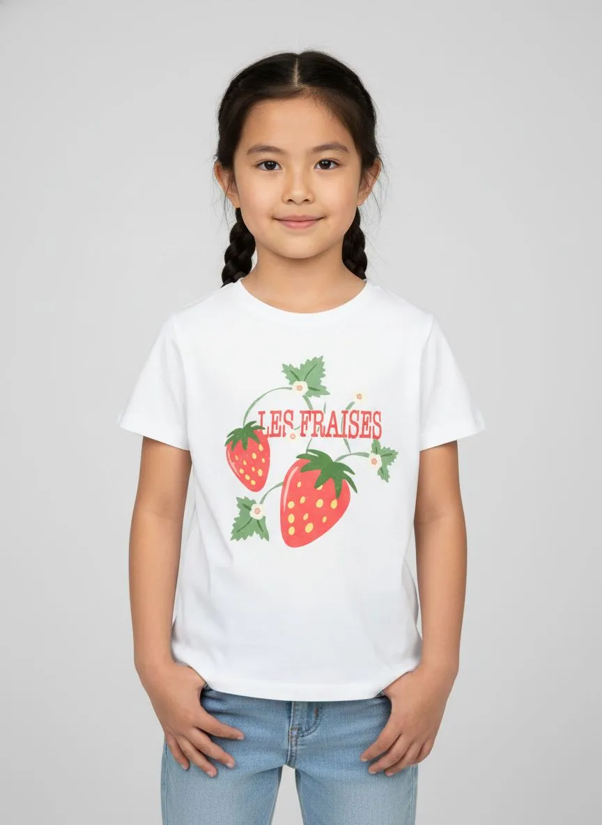 Круглый вырез обеспечивает удобную посадку и аккуратно держит форму. Передняя часть украшена принтом с клубникой, который добавляет образу свежий и игривый характер.