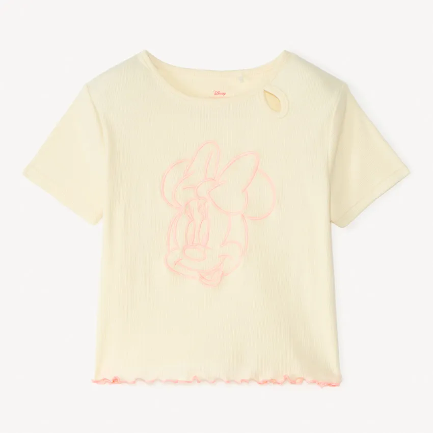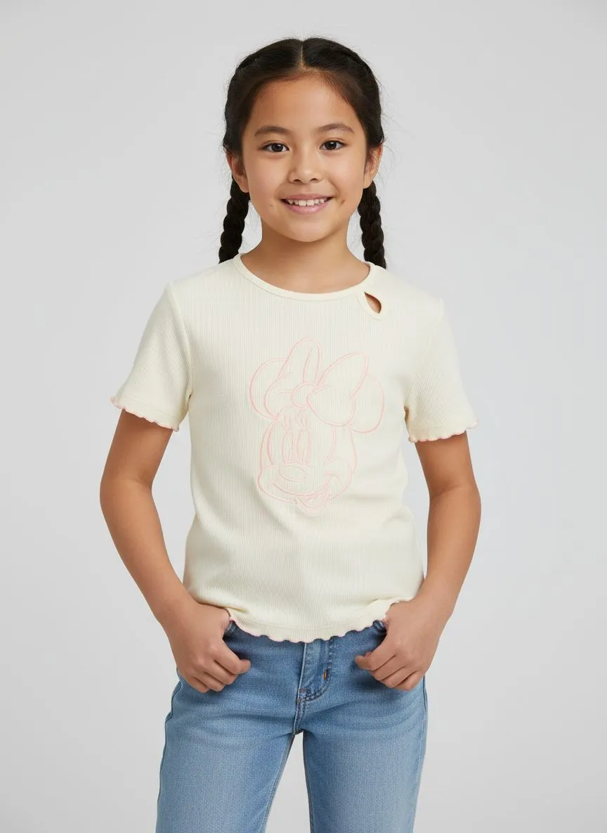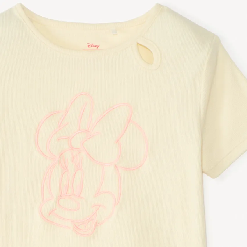 Круглый вырез украшен аккуратным ажурным элементом, придающим модели изящный и аккуратный вид. На передней части расположен вышитый рисунок с Minnie в розовом цвете.