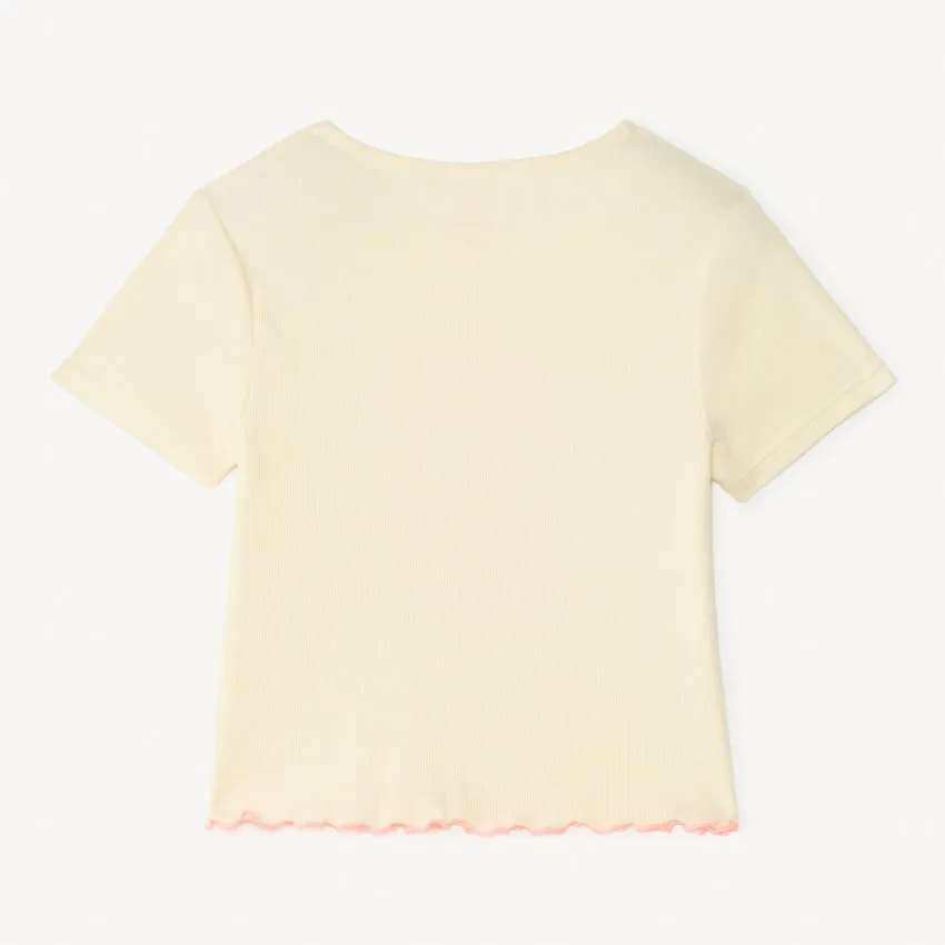 Нежная футболка в кремовом оттенке станет стильным дополнением повседневного детского гардероба. Модель выполнена из мягкого ребристого трикотажа, который хорошо тянется и обеспечивает комфорт в течение всего дня.