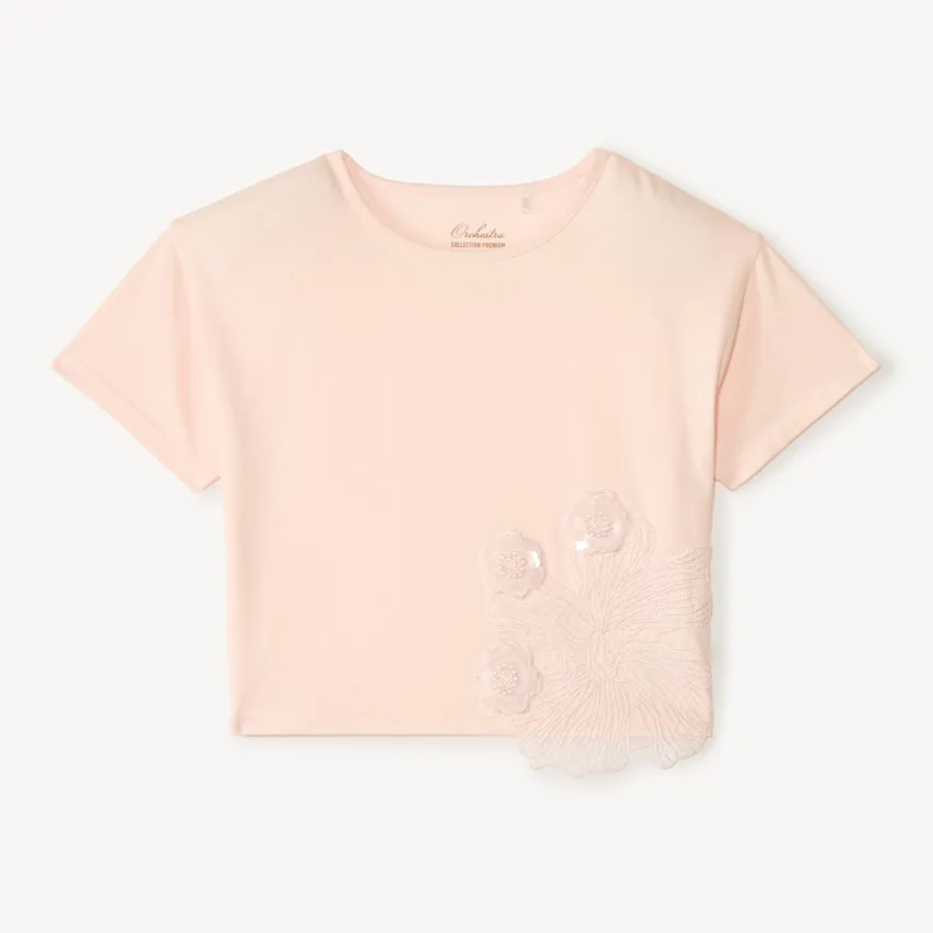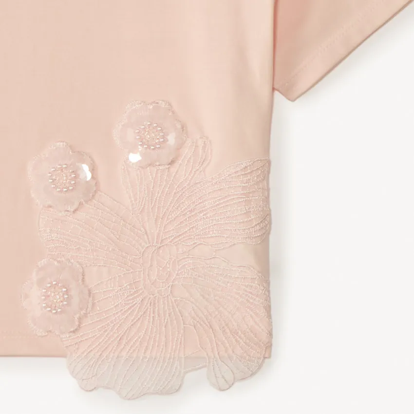 Круглый вырез обеспечивает удобную посадку, а короткие рукава делают футболку отличным вариантом для тёплой погоды. В нижней части переда расположены крупные вышитые цветы, дополненные небольшими цветочками из пайеток.