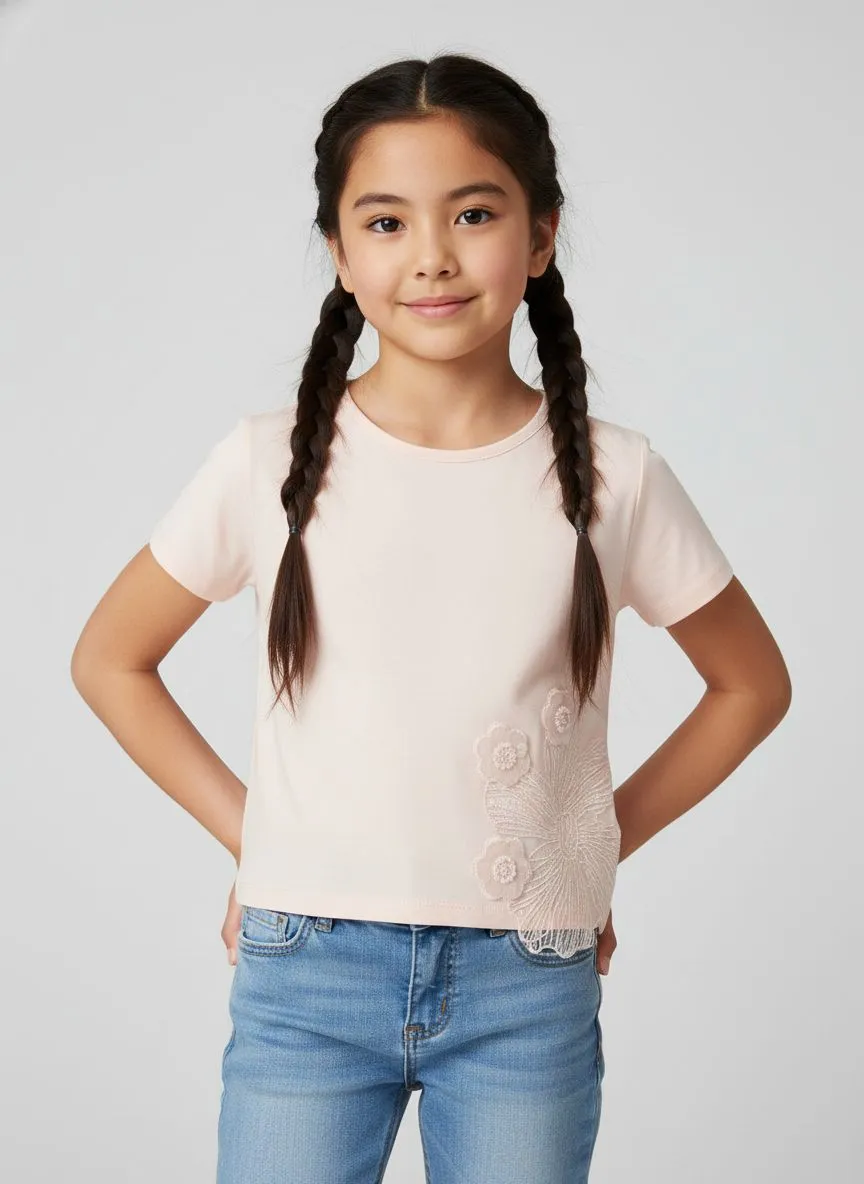 Футболка с вышивкой станет нежным и нарядным акцентом в детском гардеробе. Модель выполнена из мягкого трикотажа в однотонном цвете, который приятен к телу и обеспечивает комфорт в течение всего дня.
