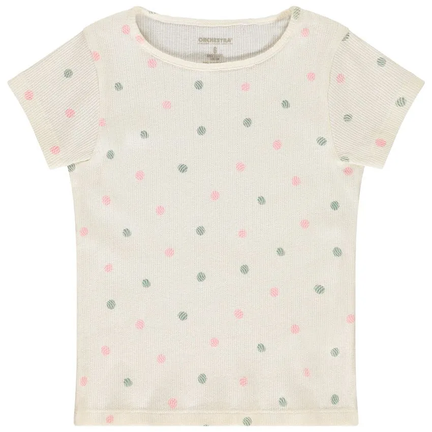 Мягкая футболка из трикотажной ткани в рубчик с короткими рукавами и контрастным принтом в горошек по всей поверхности. Круглый ребристый вырез горловины. Идеальный выбор для летних дней!