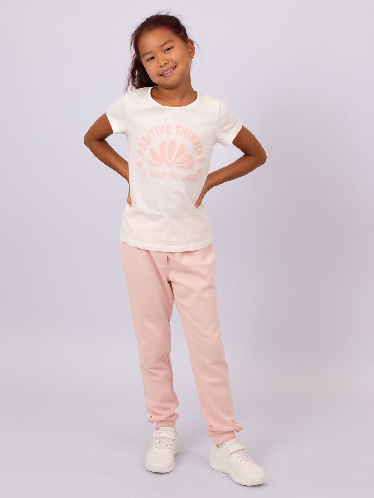 Мягкая футболка для девочки с коротким рукавом, выполнена в светлом оттенке с нежным цветочным принтом и позитивной надписью. Удобный прямой крой и натуральный материал обеспечивают комфорт на каждый день.