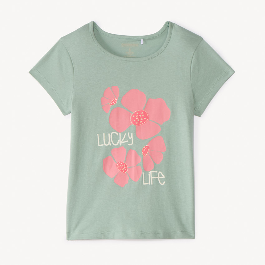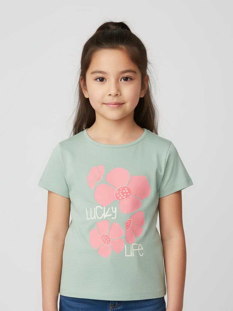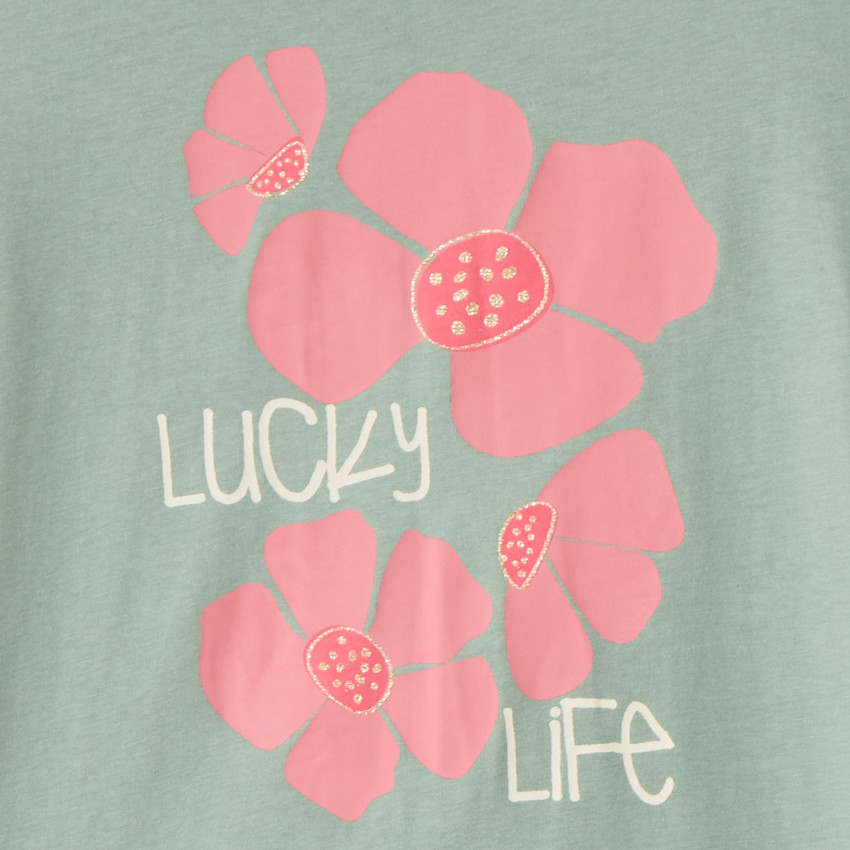 Модель дополнена аккуратным круглым вырезом и короткими рукавами, что делает её удобной для тёплой погоды. Спереди расположен яркий принт с цветами и надписью “Lucky Life”, дополненный блестящими деталями, которые придают футболке игривый и стильный вид.
