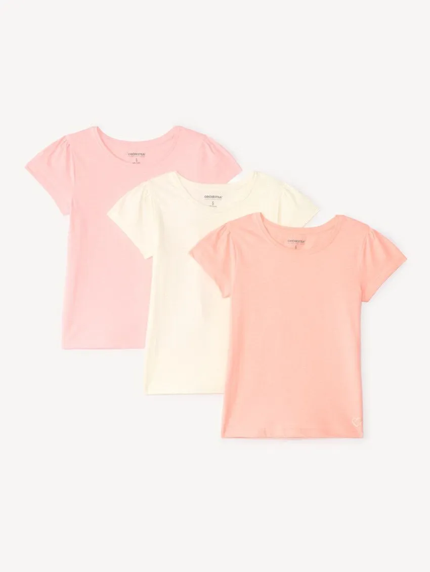 Набор из 3 футболок с коротким рукавом для девочки от Orchestra — удобный и практичный вариант для повседневного гардероба. Модели выполнены из мягкого 100% хлопка, который хорошо пропускает воздух и обеспечивает комфорт в течение всего дня. Классический крой и приятная ткань позволяют ребёнку свободно двигаться во время игр и прогулок. В нижнем углу каждой футболки расположен аккуратный блестящий принт в виде сердечка, который добавляет образу нежности и лёгкого сияния. Отличный базовый комплект для детского сада, прогулок и активного отдыха.
