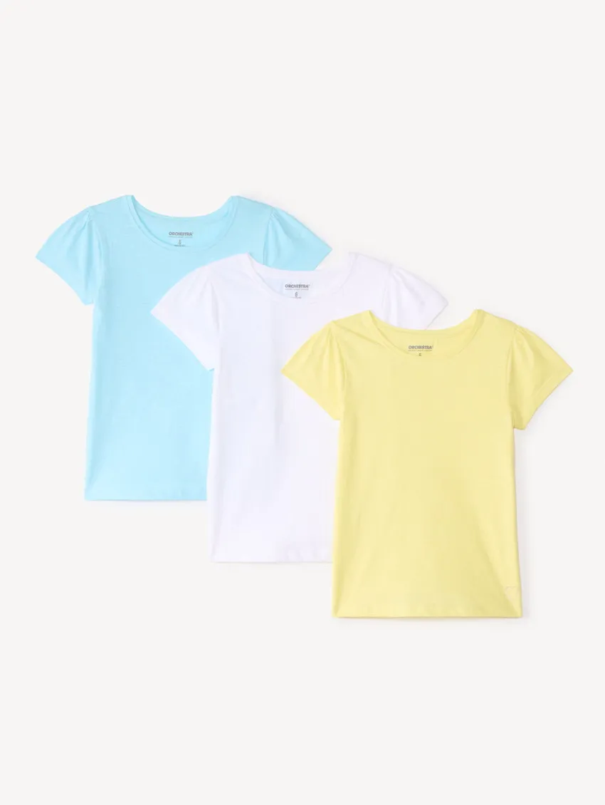Набор из 3 футболок с коротким рукавом для девочки от Orchestra — удобный и практичный вариант для повседневного гардероба. Модели выполнены из мягкого 100% хлопка, который хорошо пропускает воздух и обеспечивает комфорт в течение всего дня. Классический крой и приятная ткань позволяют ребёнку свободно двигаться во время игр и прогулок. В нижнем углу каждой футболки расположен аккуратный блестящий принт в виде сердечка, который добавляет образу нежности и лёгкого сияния. Отличный базовый комплект для детского сада, прогулок и активного отдыха.
