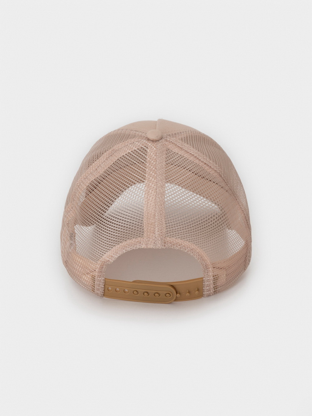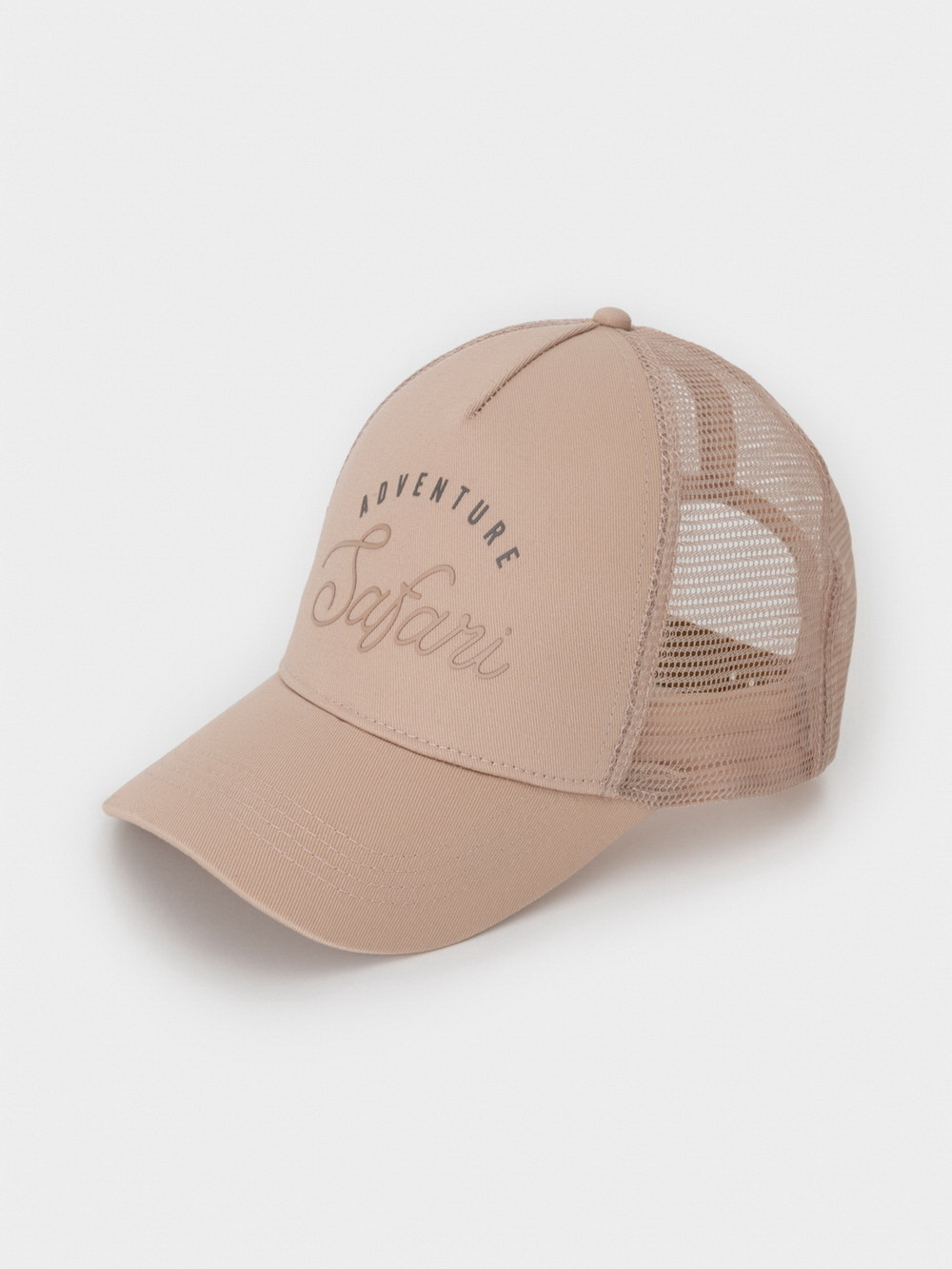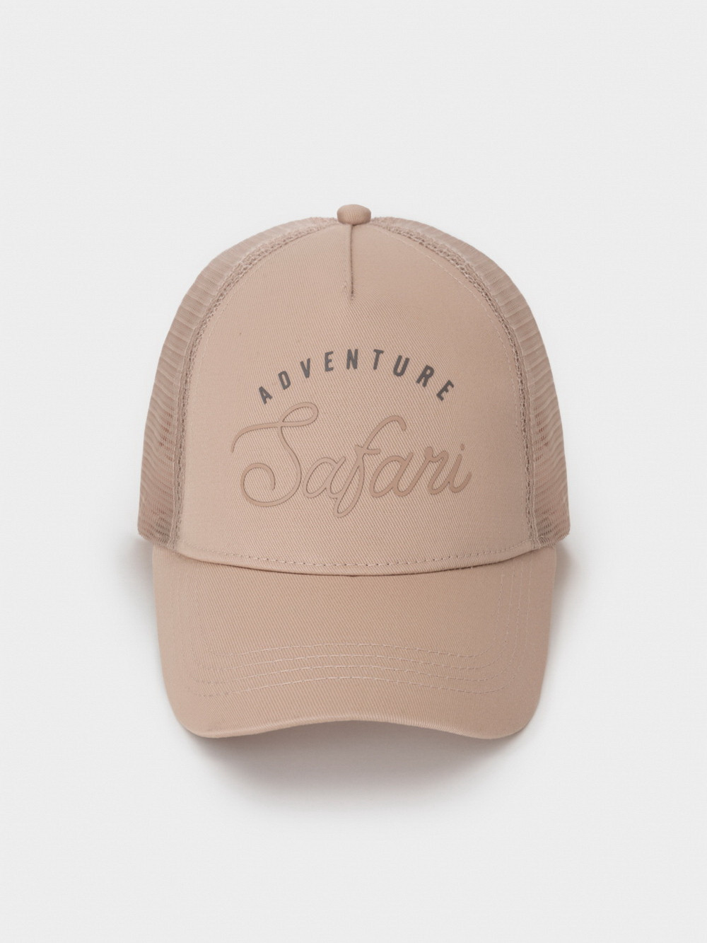 Кепка из текстиля и сетки. Спереди украшена оригинальным рельефным принтом. Регулируется по ширине головы и фиксируется на затылке с помощью пластиковой застёжки.