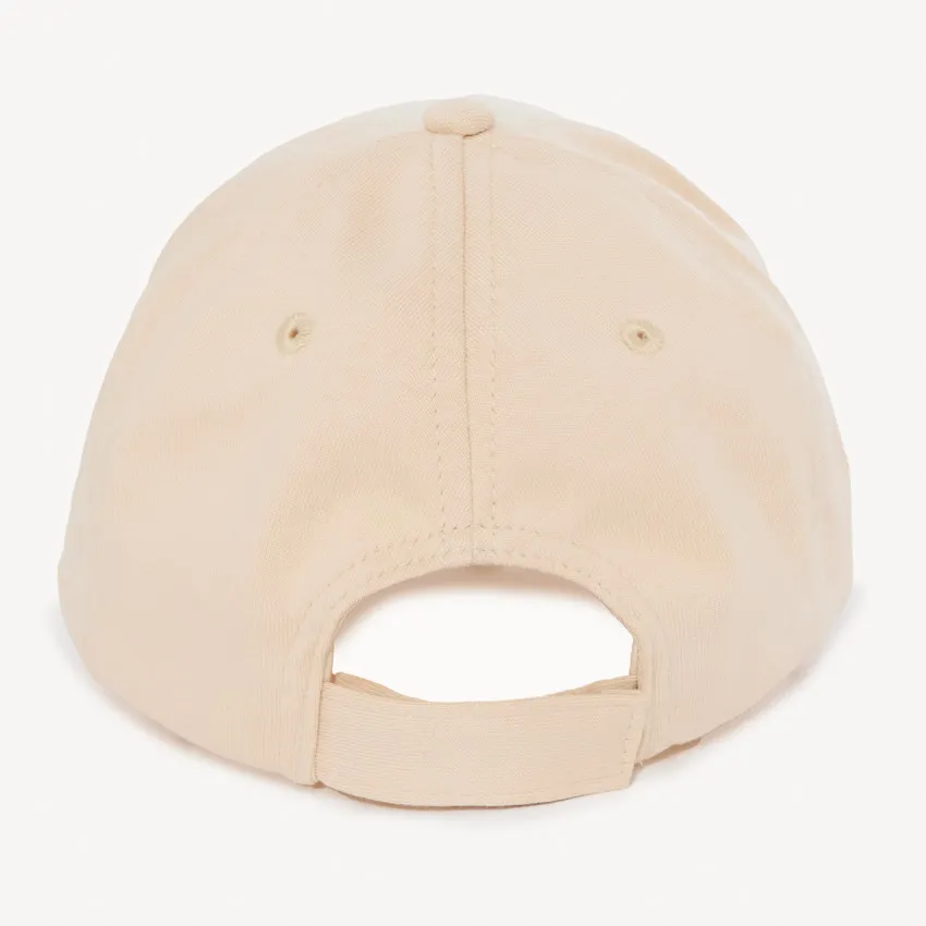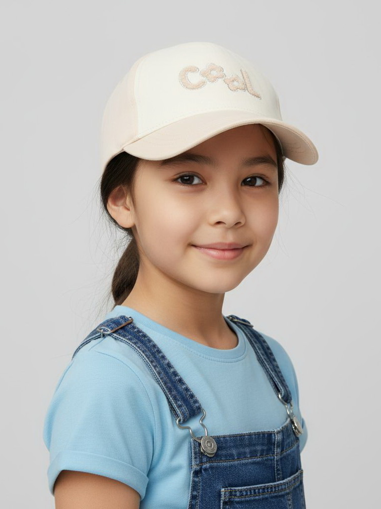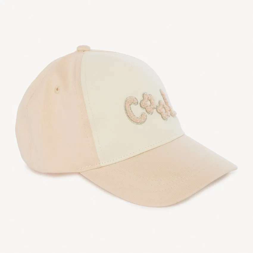 Стильная двухцветная кепка в бежево-молочном оттенке станет удобным аксессуаром для повседневных прогулок. Спереди расположена надпись «Cool» с декоративными элементами и золотистым люрексом.