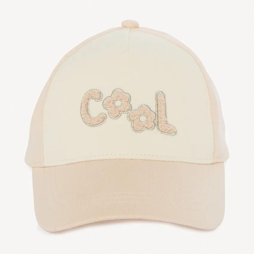 Стильная двухцветная кепка в бежево-молочном оттенке станет удобным аксессуаром для повседневных прогулок. Спереди расположена надпись «Cool» с декоративными элементами и золотистым люрексом.