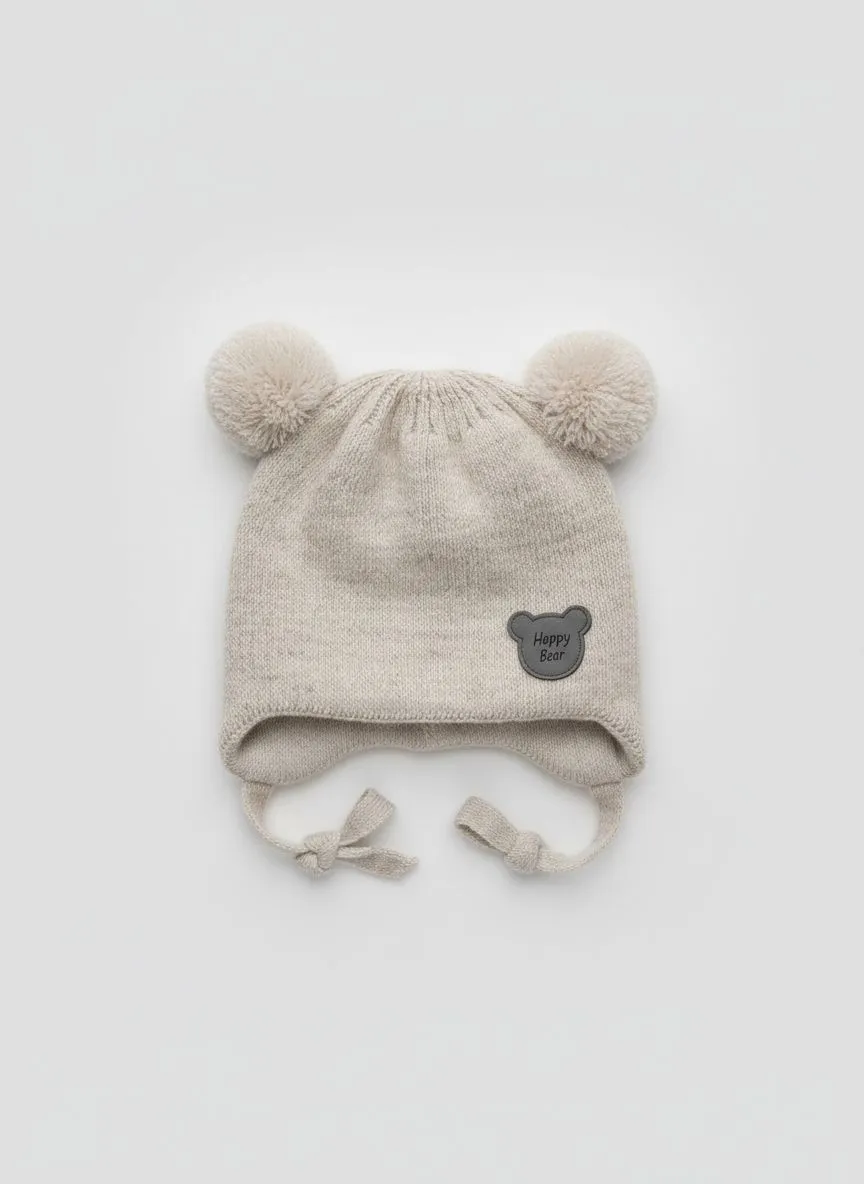 Вязаная детская шапка бежевого цвета с завязками и объёмными помпонами-ушками. Украшена нашивкой с надписью Happy Bear. Модель выполнена из мягкой пряжи с добавлением шерсти, хорошо сохраняет тепло и обеспечивает комфорт в прохладную погоду. Подходит для сезона весна/осень.
