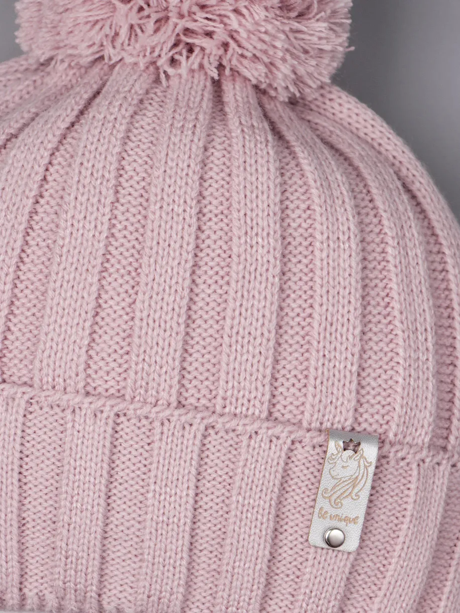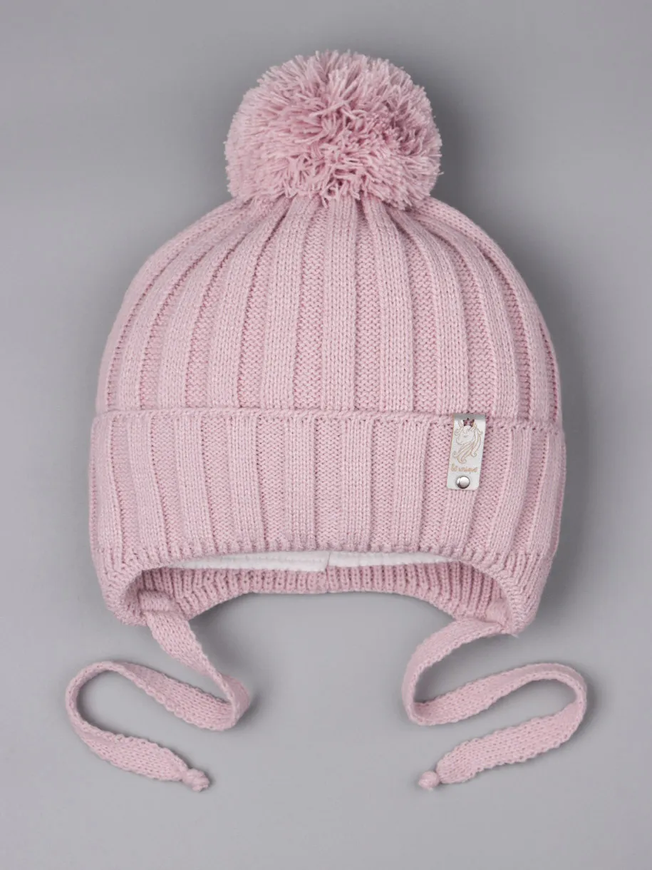 Детская вязаная шапка с завязками и объёмным помпоном. Модель выполнена в пудровом цвете из пряжи с содержанием гипоаллергенного акрила, внутри мягкая хлопковая подкладка. Хорошо сохраняет тепло, комфортна в носке и надёжно фиксируется на голове благодаря завязкам. Отличный выбор для сезона весна/осень.