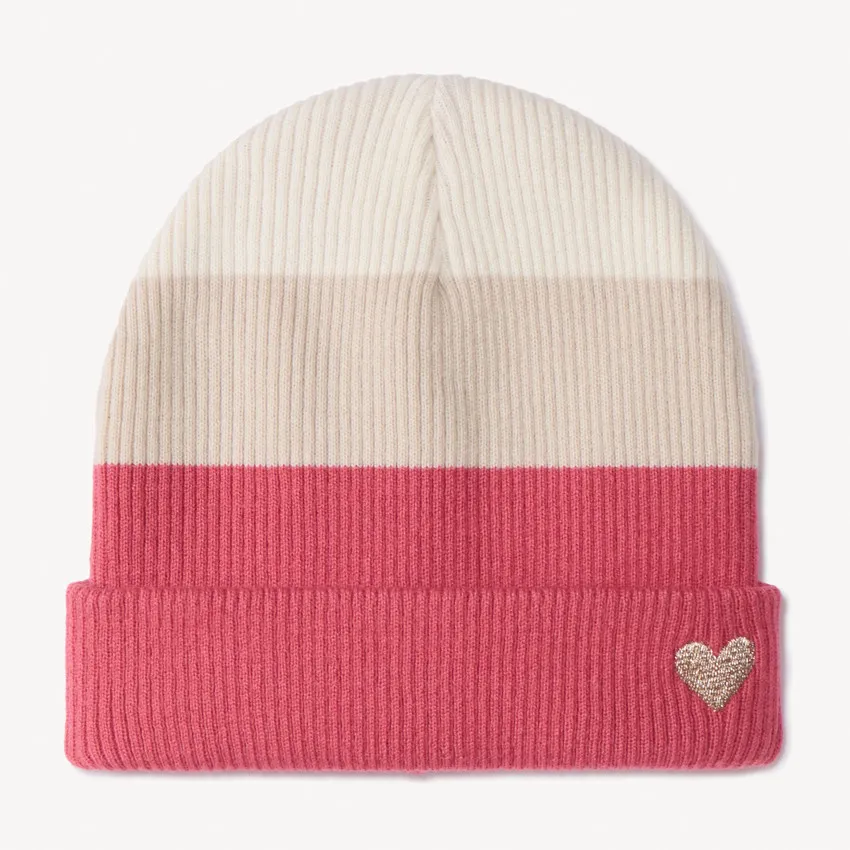 Вязаная шапка в рубчик с модным эффектом color block в розовом оттенке. Нижний край выполнен с подворотом, украшенным изящным сердечком из золотистого люрекса.