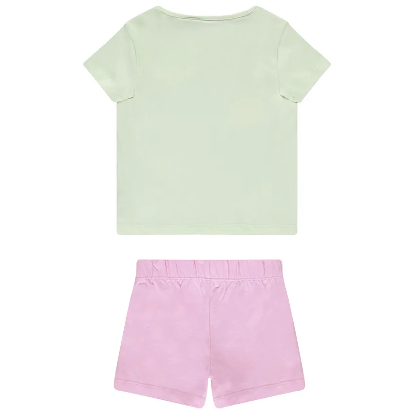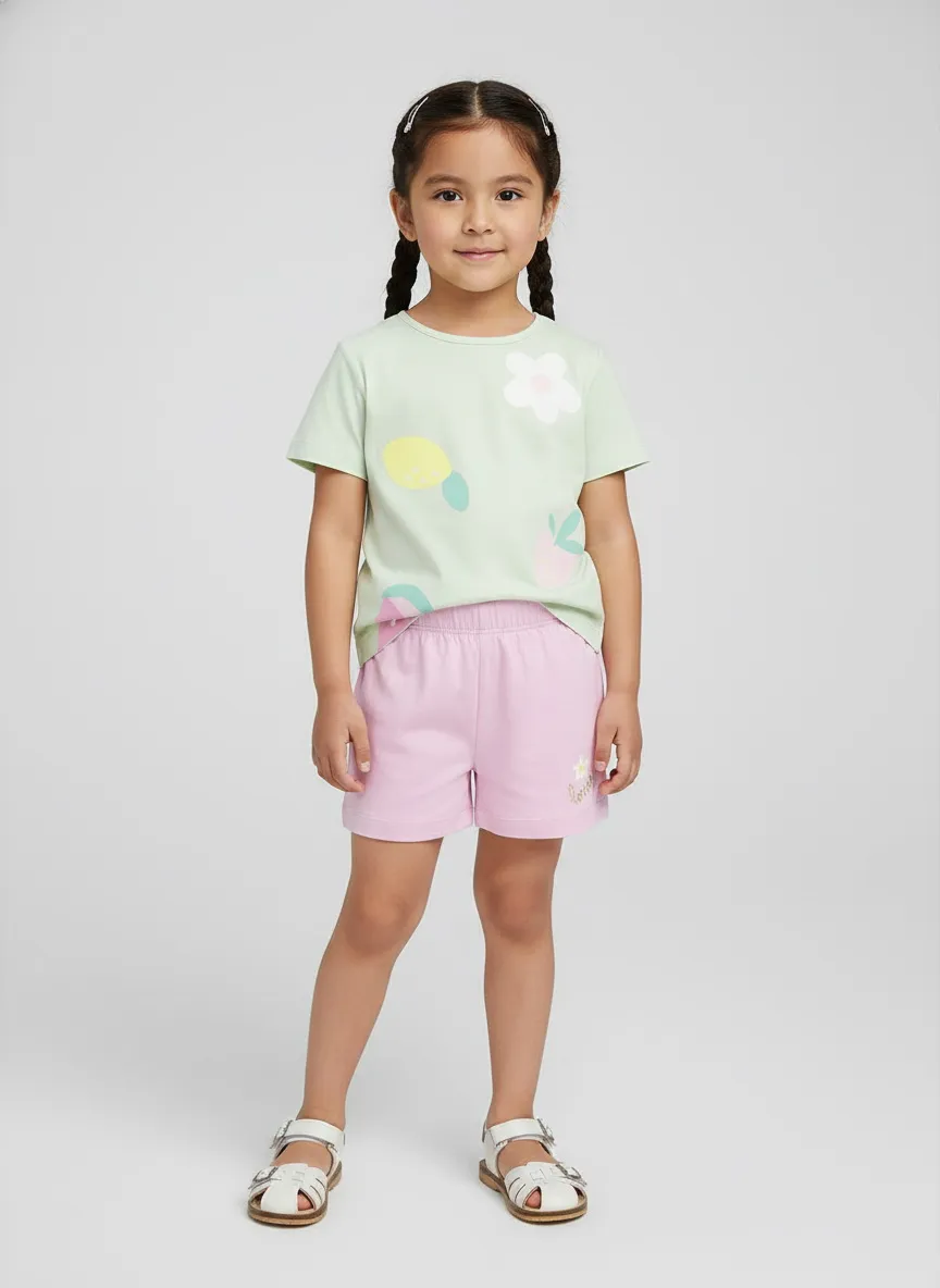 Футболка с коротким рукавом украшена принтом спереди, который делает образ ярким и милым. Шорты с эластичной талией обеспечивают комфортную посадку и свободу движений ребёнка.