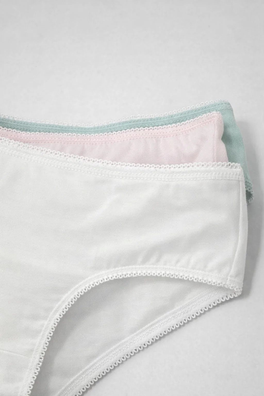 Набор из 7 трусиков из мягкого трикотажа в розовом, экрю и зелёном цветах. Эластичный пояс и резинки по ножкам с волнистой отделкой обеспечивают комфортную посадку и нежный внешний вид.