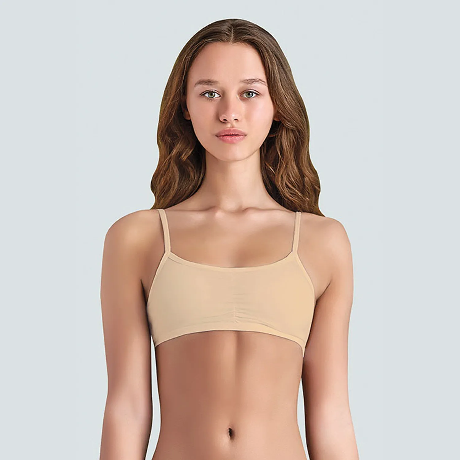 Топ со съемными вкладышами для девочки на тонких бретелях. Выполнен из натуральной хлопчатобумажной ткани с добавлением эластана, что улучшает посадку изделия. Натуральная трикотажная ткань «дышит», сохраняет тепло- и влагообмен, мягкий материал не натирает нежную кожу.
