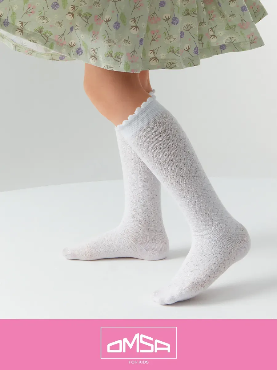 Ажурные гольфы для девочек с рисунком в виде ромбов и оригинальным декоративным бортом. Выполнены из мягкого дышащего хлопка с добавлением полиамида и эластана. Материал приятен к телу, впитывает влагу и подходит для чувствительной кожи. Плоский шов и мягкая эластичная резинка обеспечивают комфорт при носке. Гольфы хорошо облегают, не теряют форму и цвет после стирки.