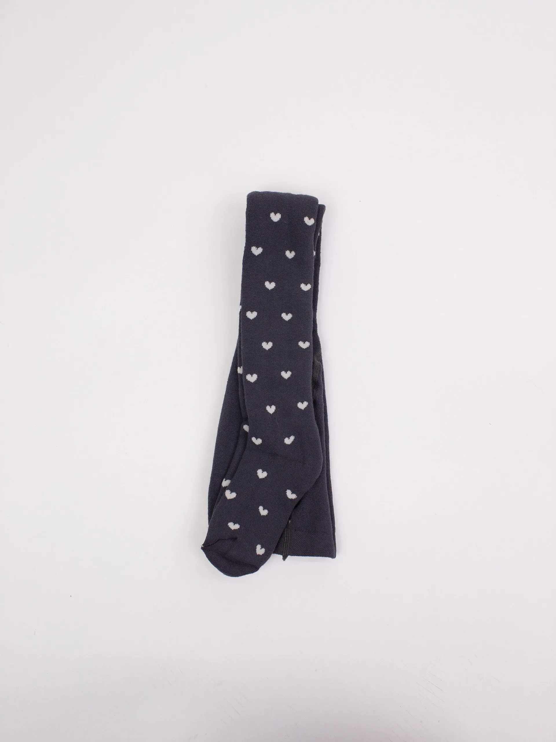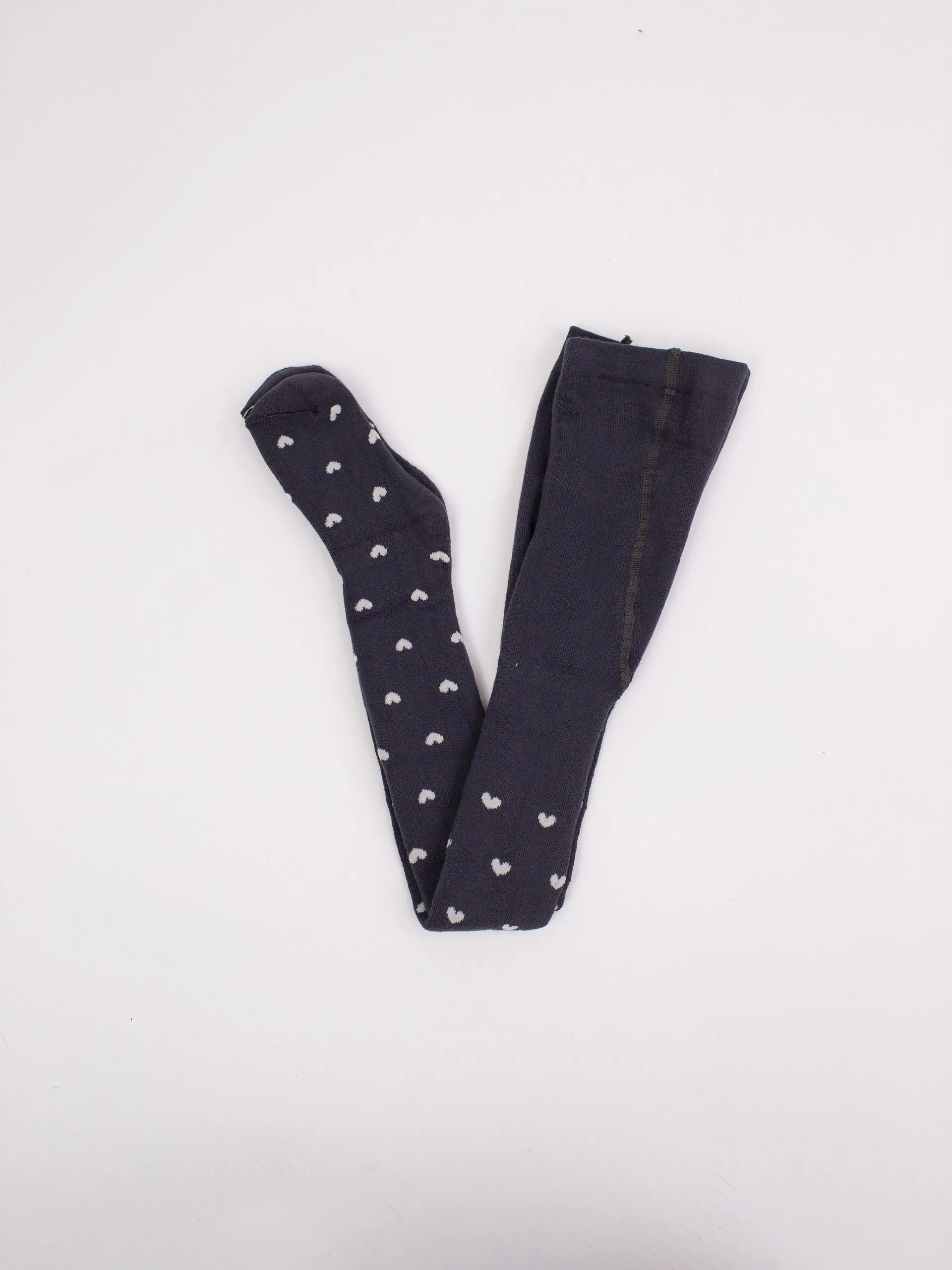 Тёмно-серые детские колготки с милым узором из белых сердечек. Мягкие, удобные и эластичные — отлично сидят и подойдут как для повседневной носки, так и для особых случаев.