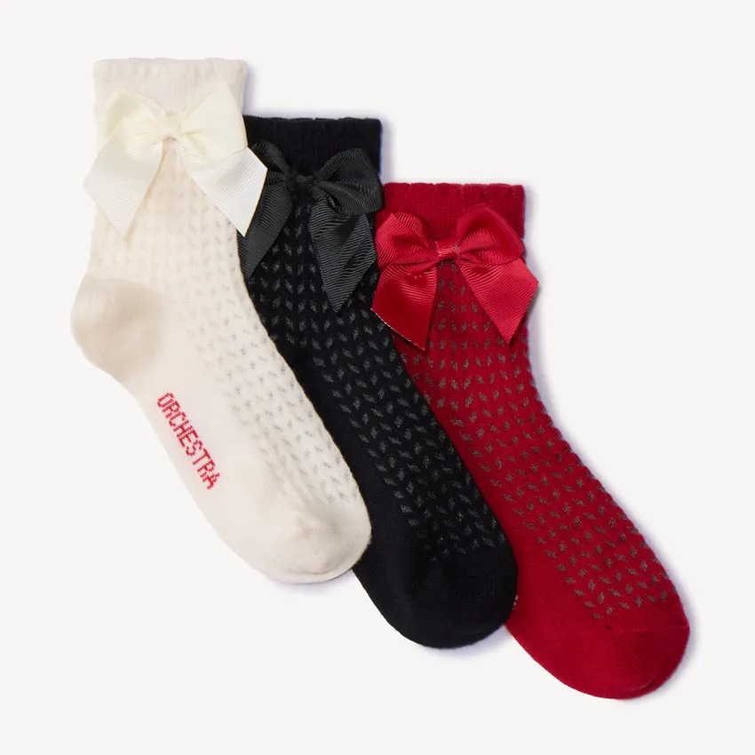 Набор из трёх пар носков из мягкого трикотажа. В комплекте — однотонные модели в цветах экрю, чёрный и красный. Манжеты выполнены с волнистым краем и украшены крупным атласным бантом.