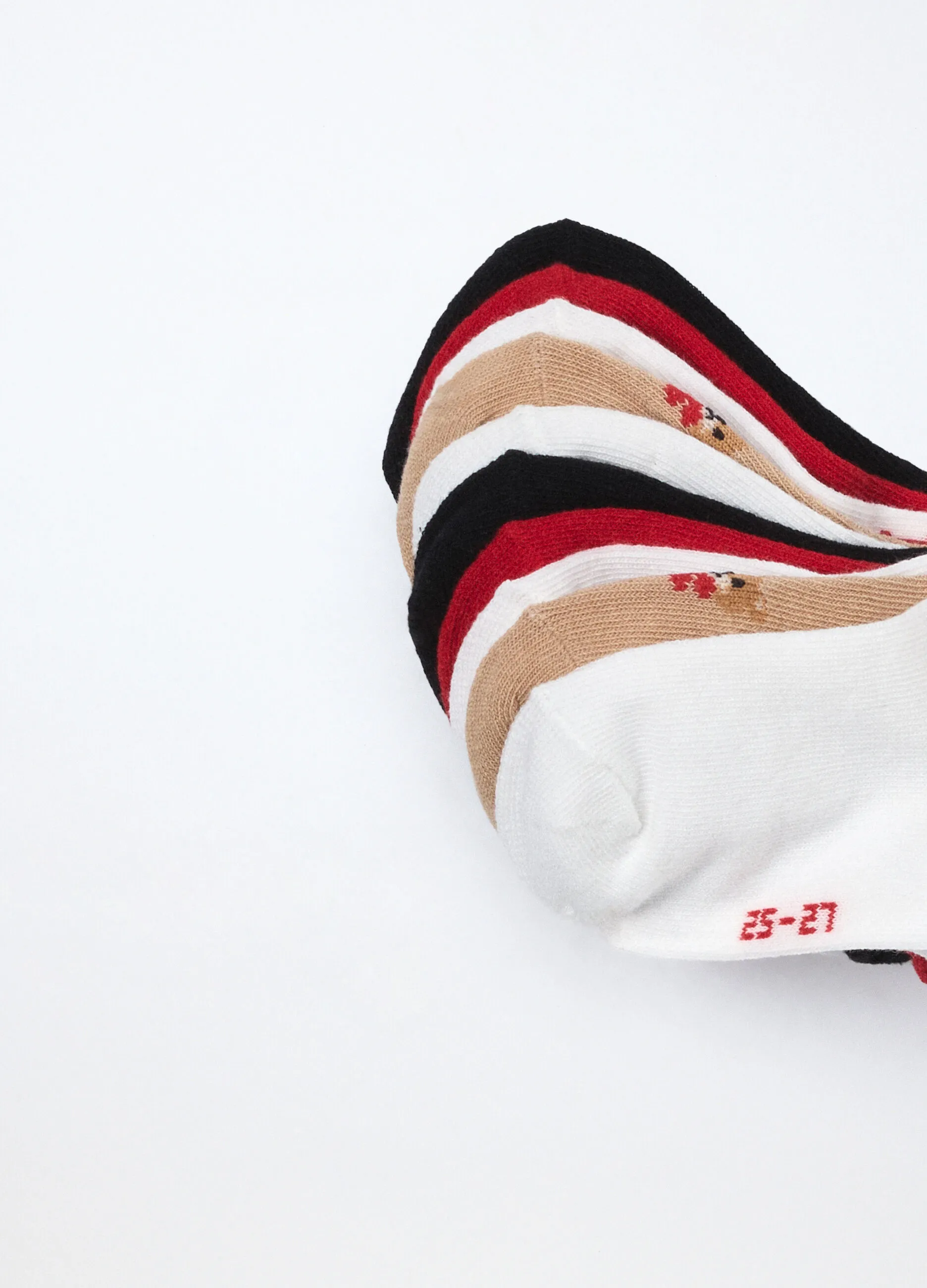 Набор детских носков “Teddy Mix” включает пять пар носков в разных цветах — чёрном, красном, белом и бежевом. Изготовлены из мягкого хлопкового материала с добавлением эластана, благодаря чему носки хорошо тянутся, комфортно сидят и не сползают. Модели украшены милыми медвежатами и надписями, что делает их ярким акцентом в детском гардеробе. Материал дышащий, приятный к коже и устойчивый к многократным стиркам. Подходят для повседневной носки — в сад, школу или на прогулку.
