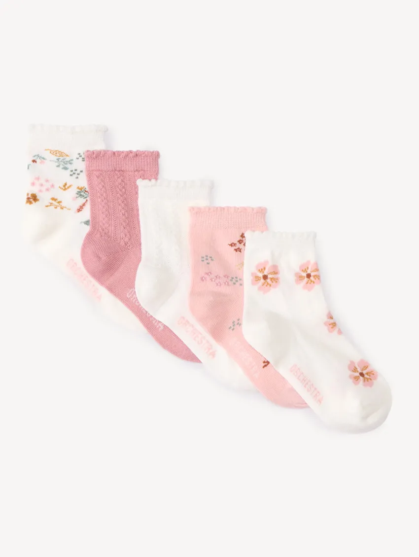Набор из пяти пар нарядных носков для девочек с аккуратным фестончатым краем. Мягкий и приятный к коже материал обеспечивает комфорт в течение всего дня, а эластичная посадка хорошо держится на ножке. Отлично подходят как для повседневных образов, так и для особых случаев.