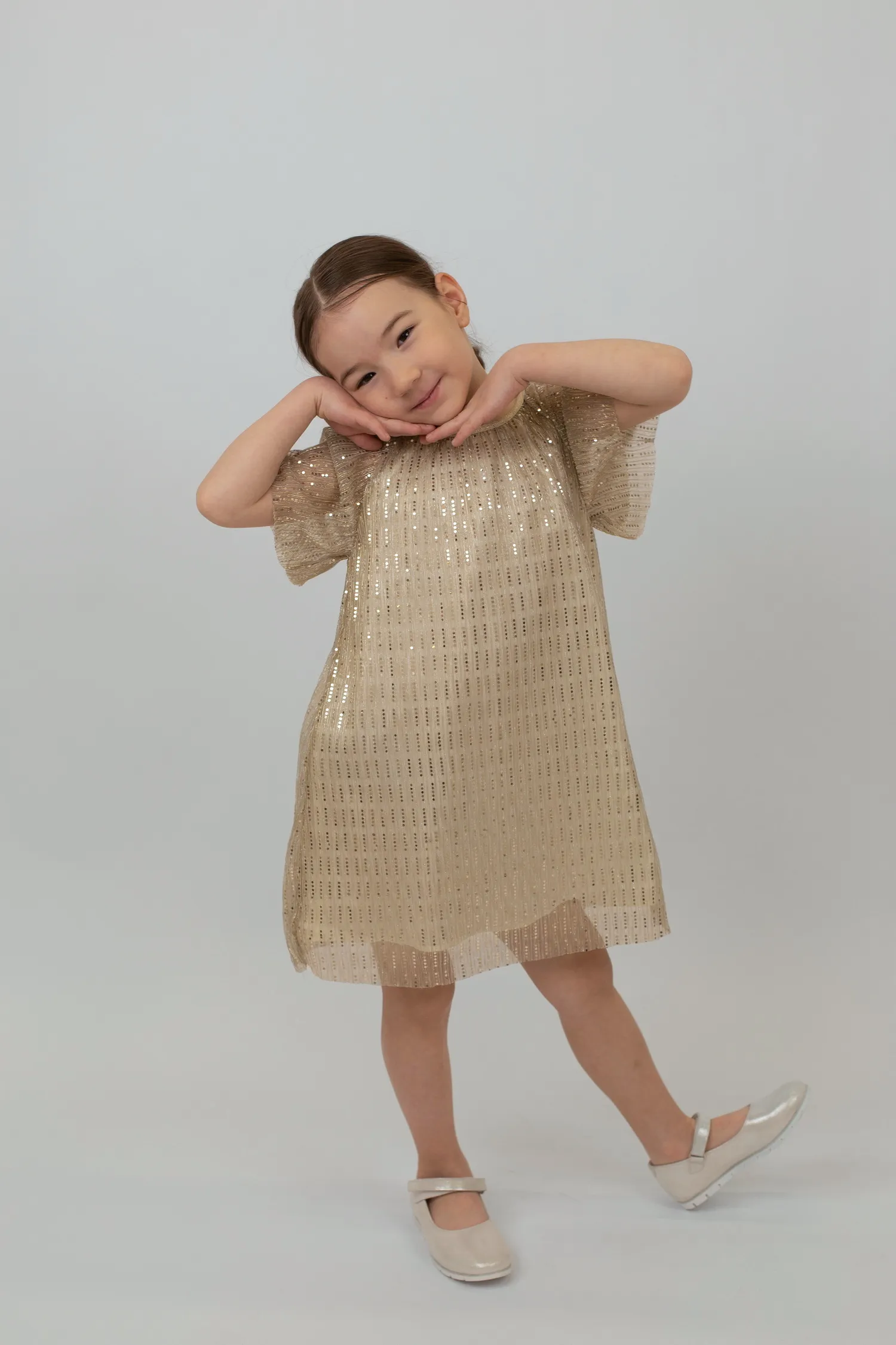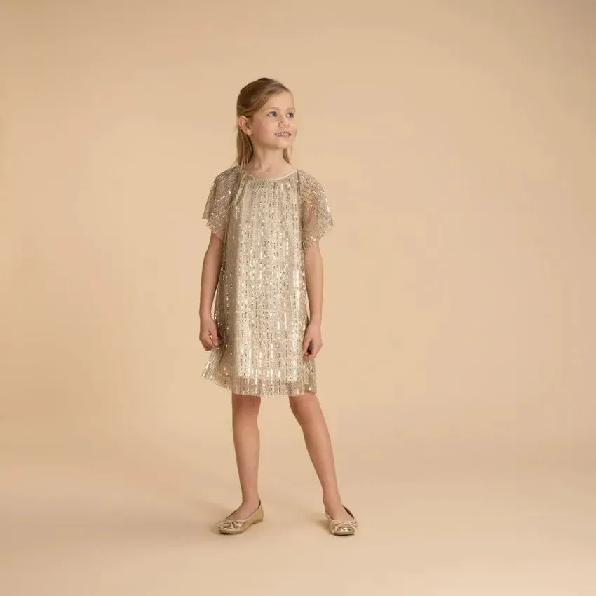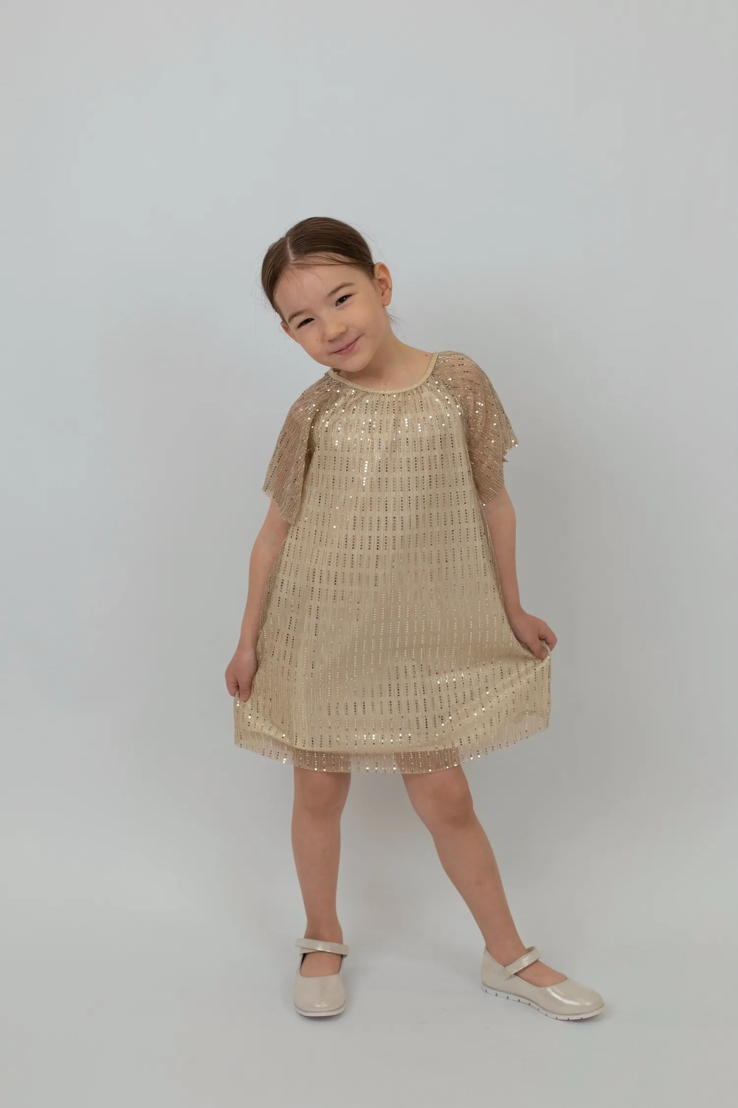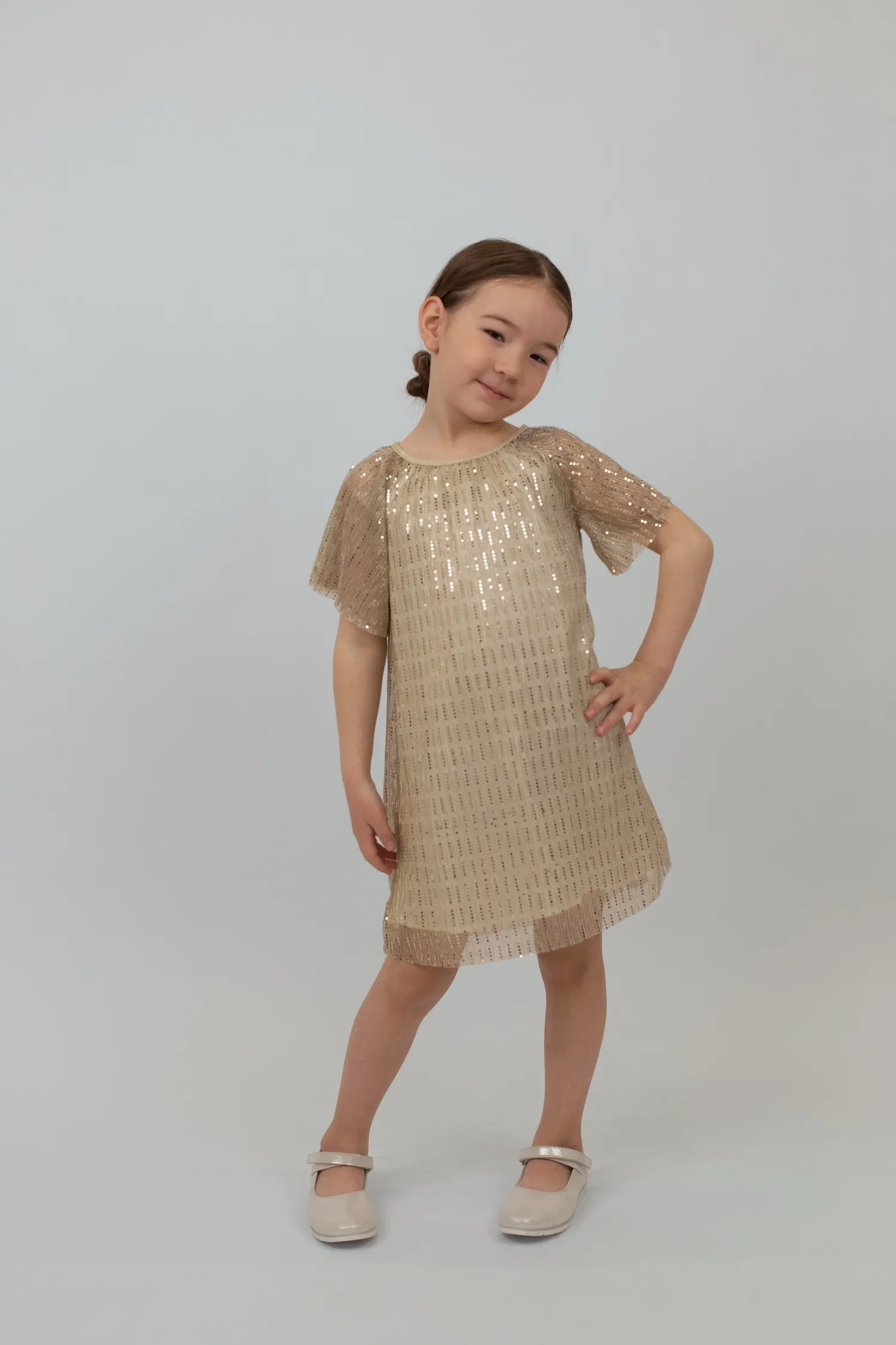 Нарядное платье с короткими рукавами из блестящей ткани. Круглый вырез горловины и спущенные рукава реглан добавляют изысканности, а необработанная отделка рукавов и подола придает платью легкость и современный вид. Подкладка из атласа создает дополнительный комфорт. Внешний материал: 100% полиэстер, подкладка: 100% хлопок.