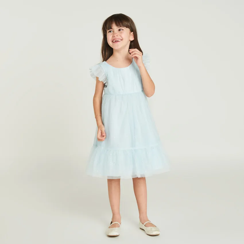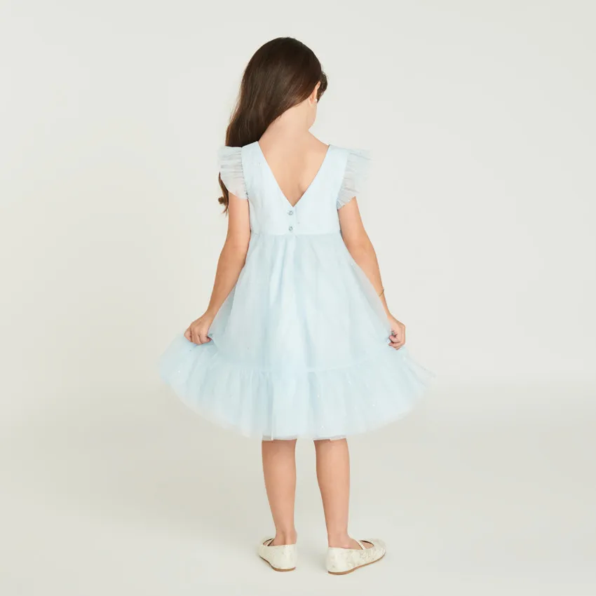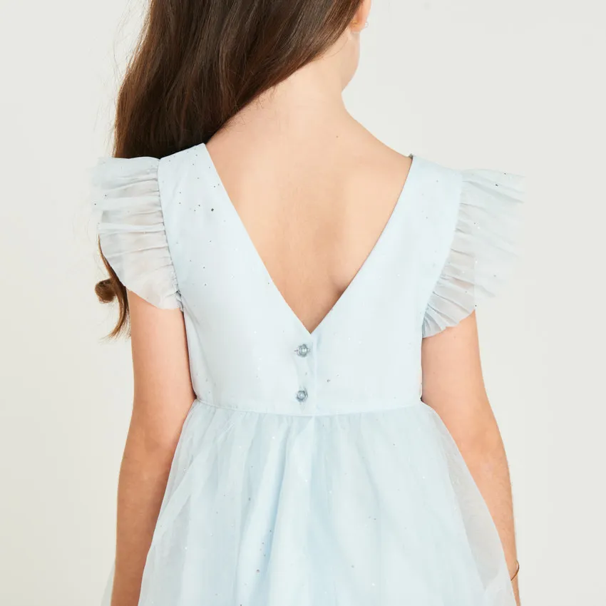 Нарядное платье в нежном пастельно-голубом цвете создаёт лёгкий и праздничный образ. Модель выполнена из лёгкой сетчатой ткани с серебристыми блестящими элементами по всей поверхности, которые красиво переливаются при движении.