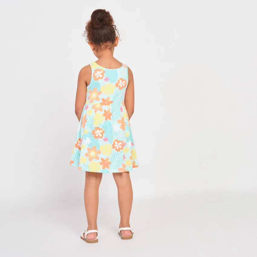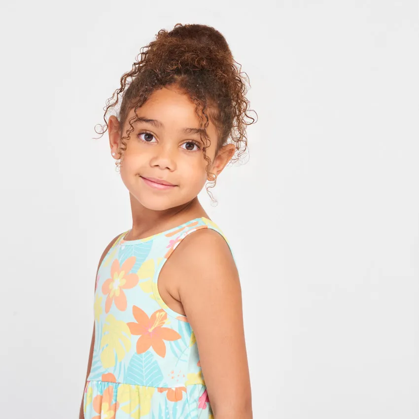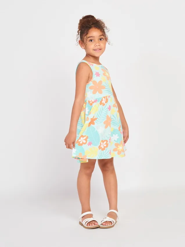 Лёгкое и удобное летнее платье для девочки выполнено из мягкого трикотажа, который приятно ощущается на коже и хорошо пропускает воздух. Такая ткань обеспечивает комфорт даже в тёплую погоду и подходит для активного дня ребёнка.