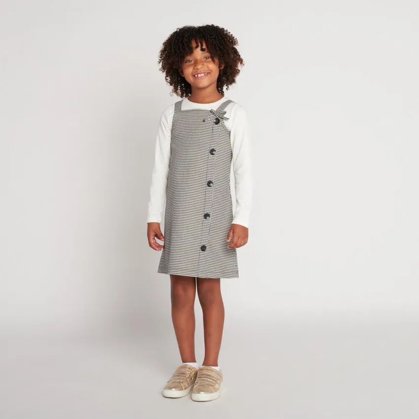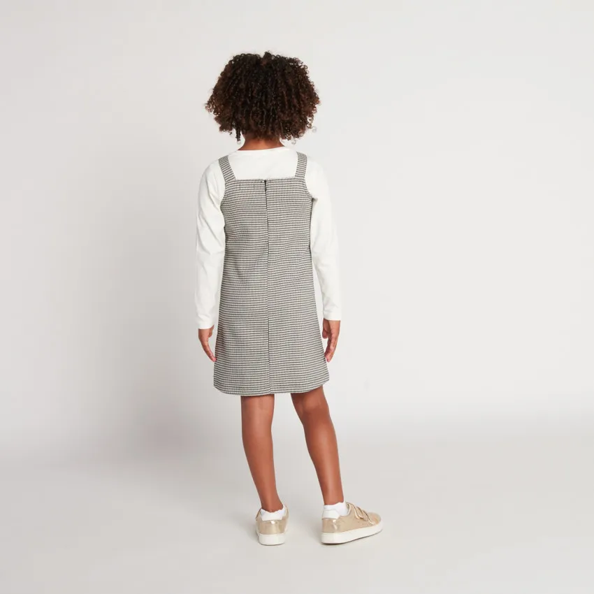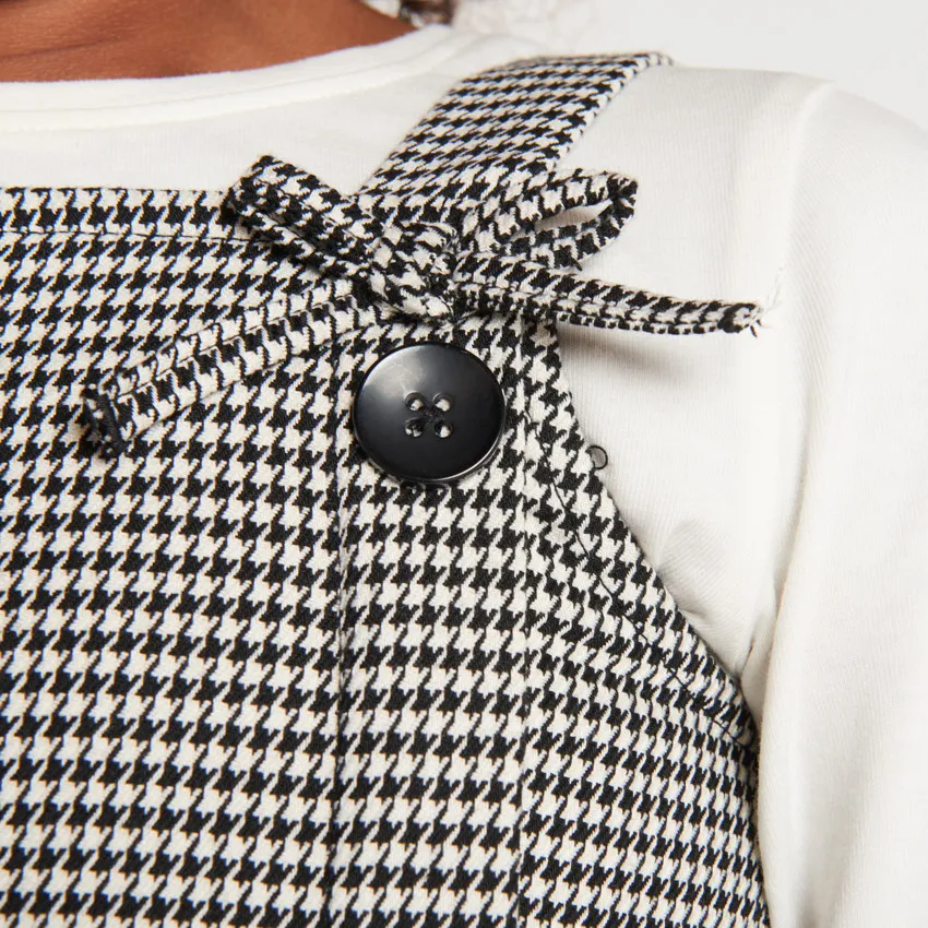 Сарафан без рукавов из плотной ткани в сочетании кремового и чёрного цветов с узором «гусиная лапка» по всей поверхности. Квадратный вырез горловины, декоративный бантик у основания одной из бретелей. Спереди декоративные пуговицы по всей длине, сзади — застёжка-молния на всю длину.