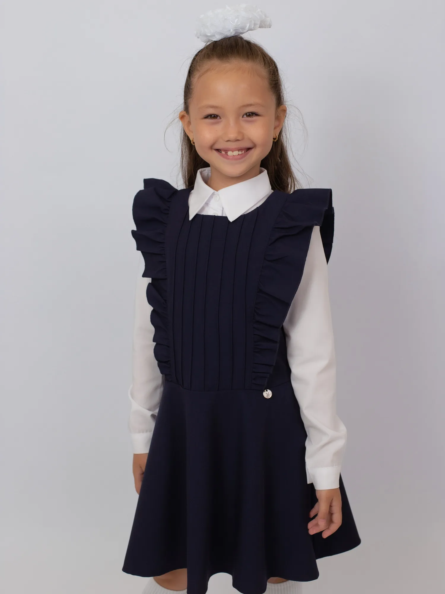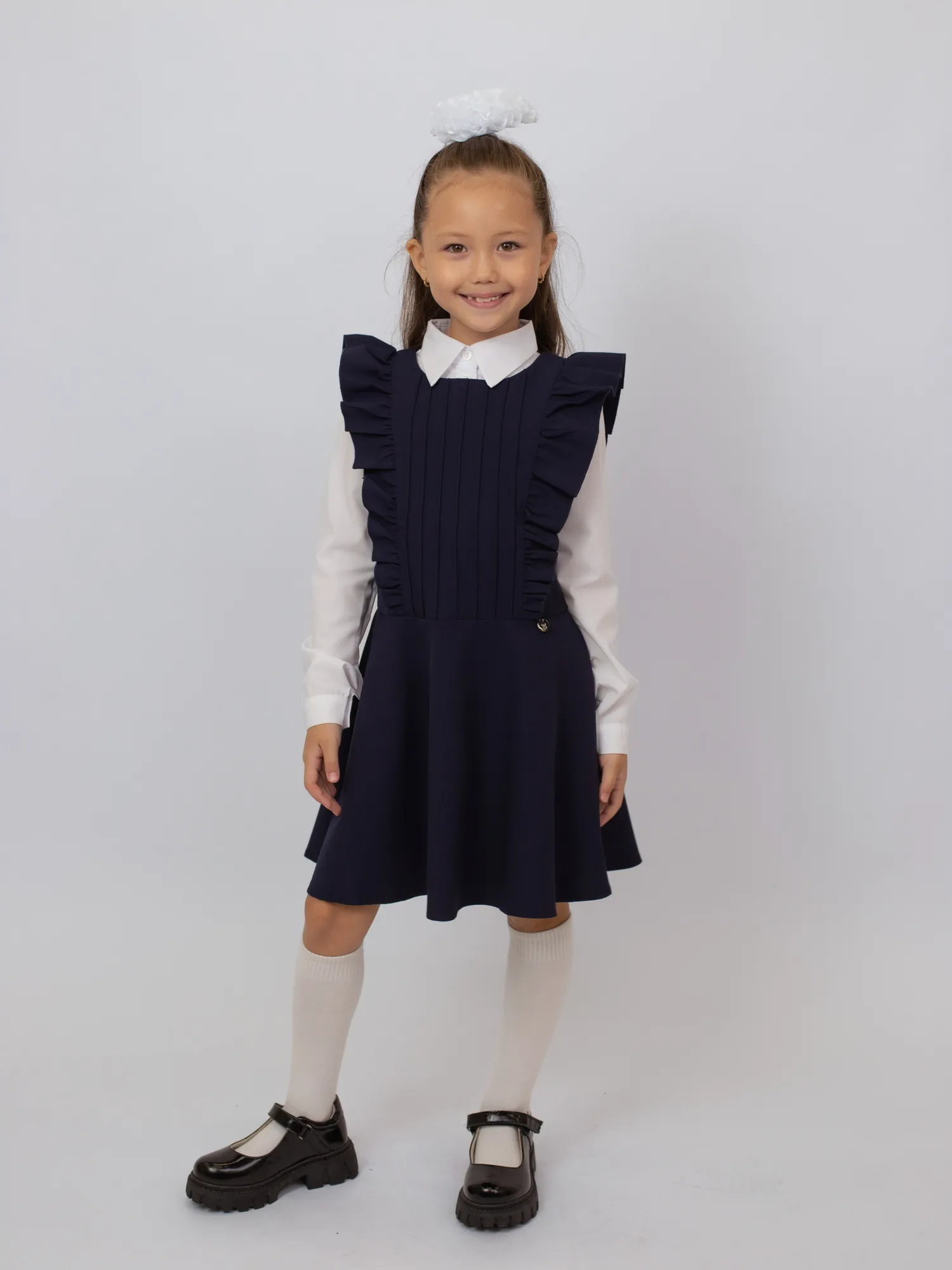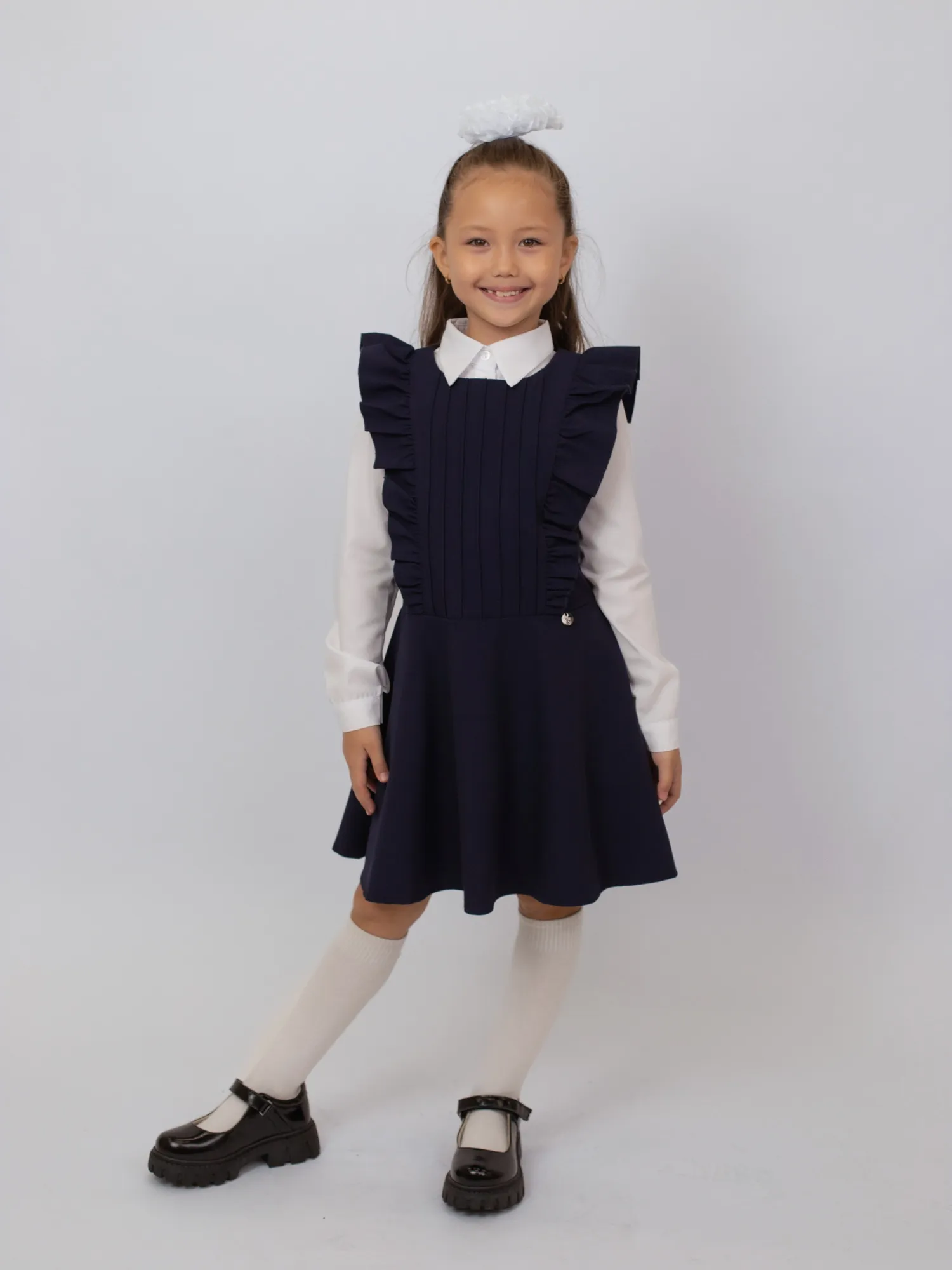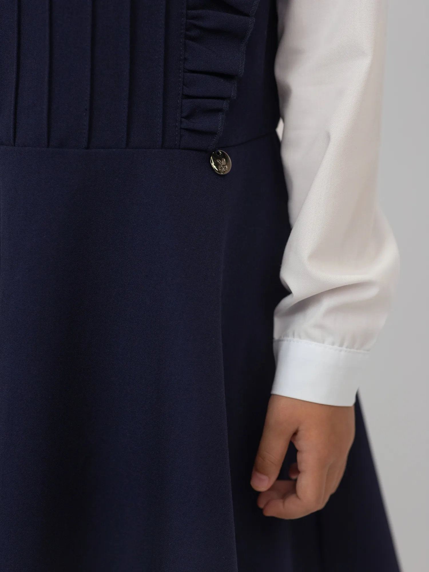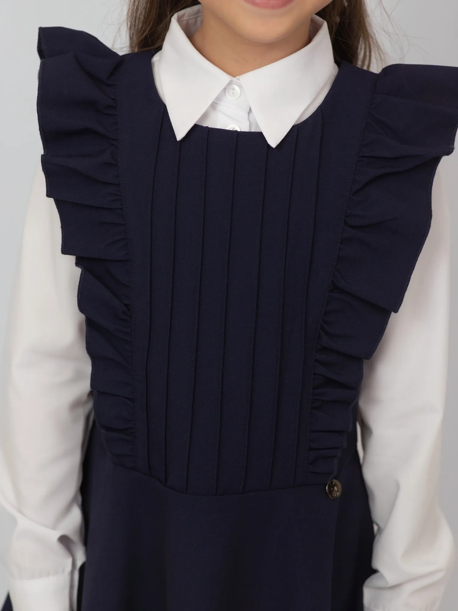 Удобный и практичный школьный сарафан выполнен из ткани с составом: 68% полиэстер, 28% вискоза, 4% спандекс. Материал прочный, не мнётся, приятный к телу и немного тянется, обеспечивая комфорт и свободу движений. Спереди — накладной карман, добавляющий удобства и стильный акцент. Идеален для повседневной школьной формы.