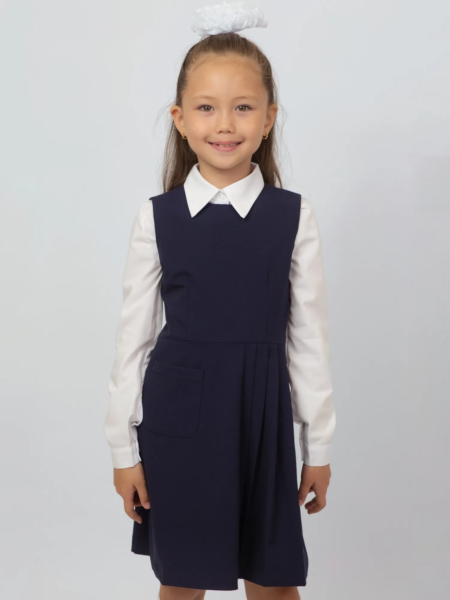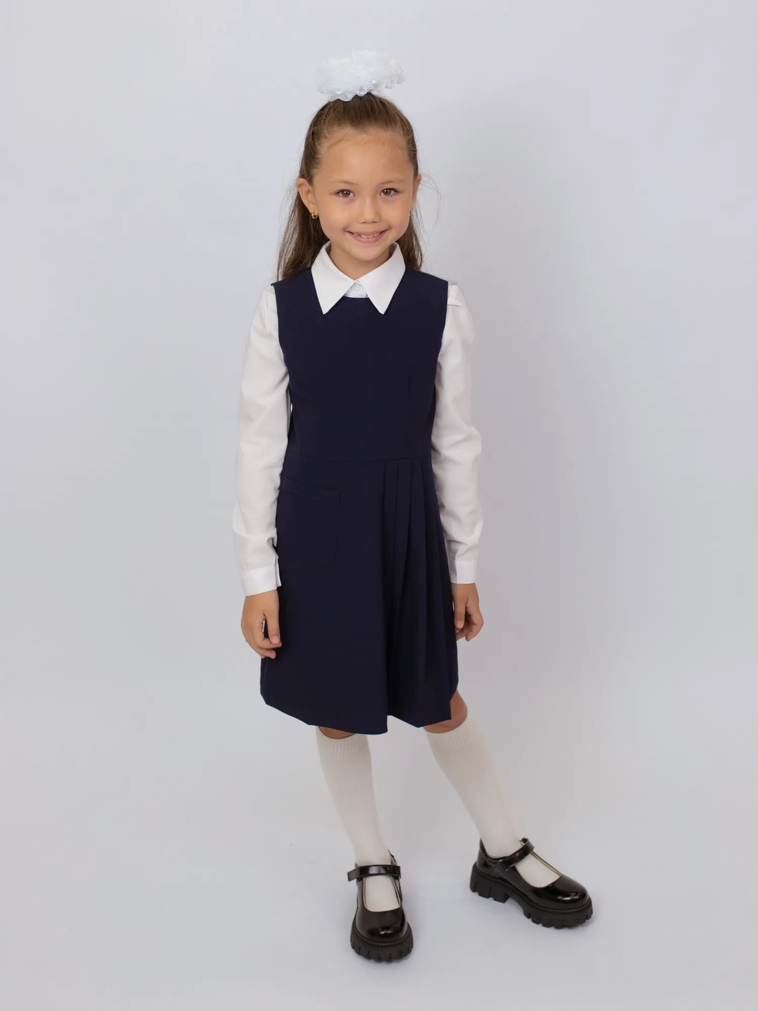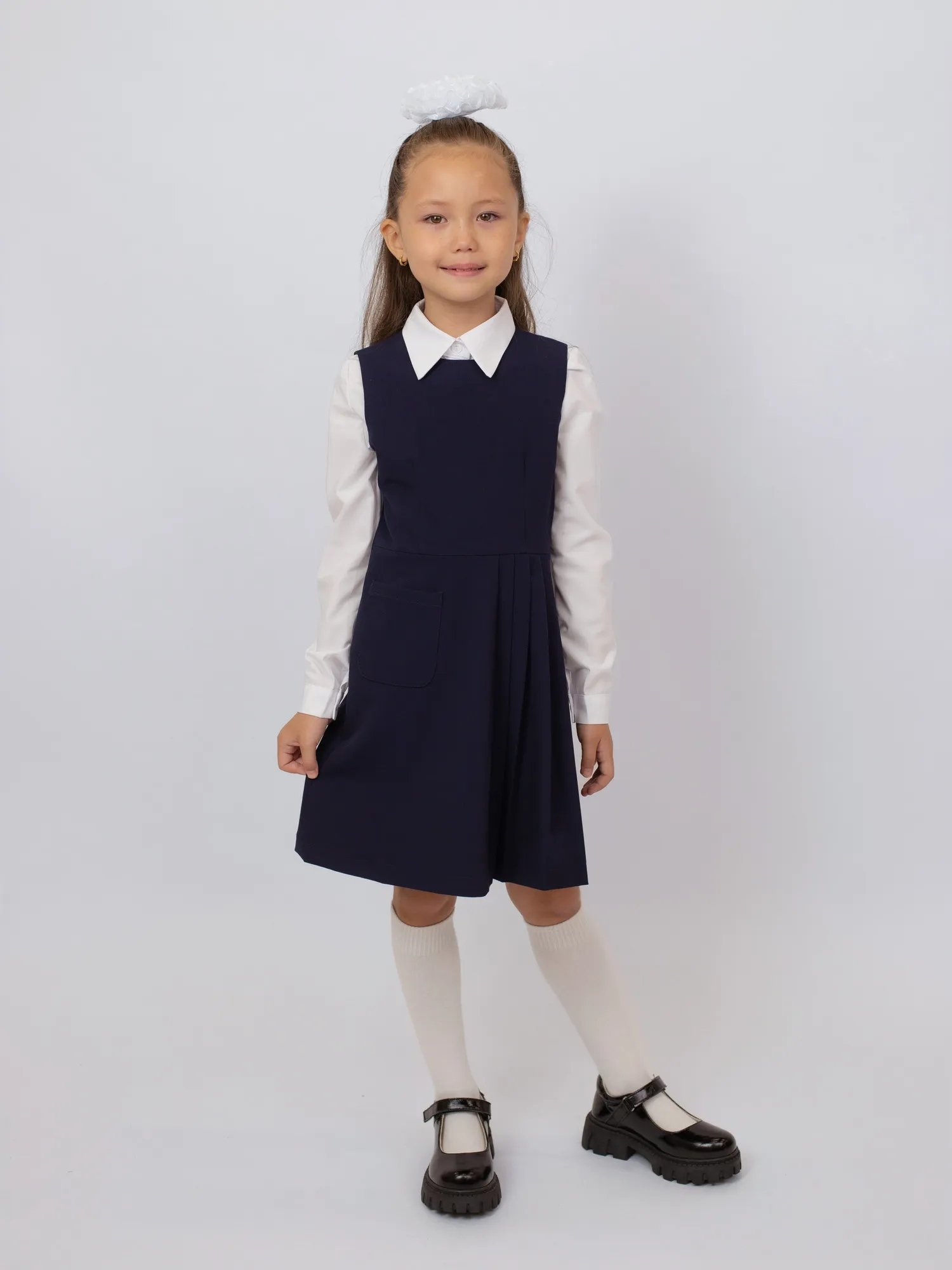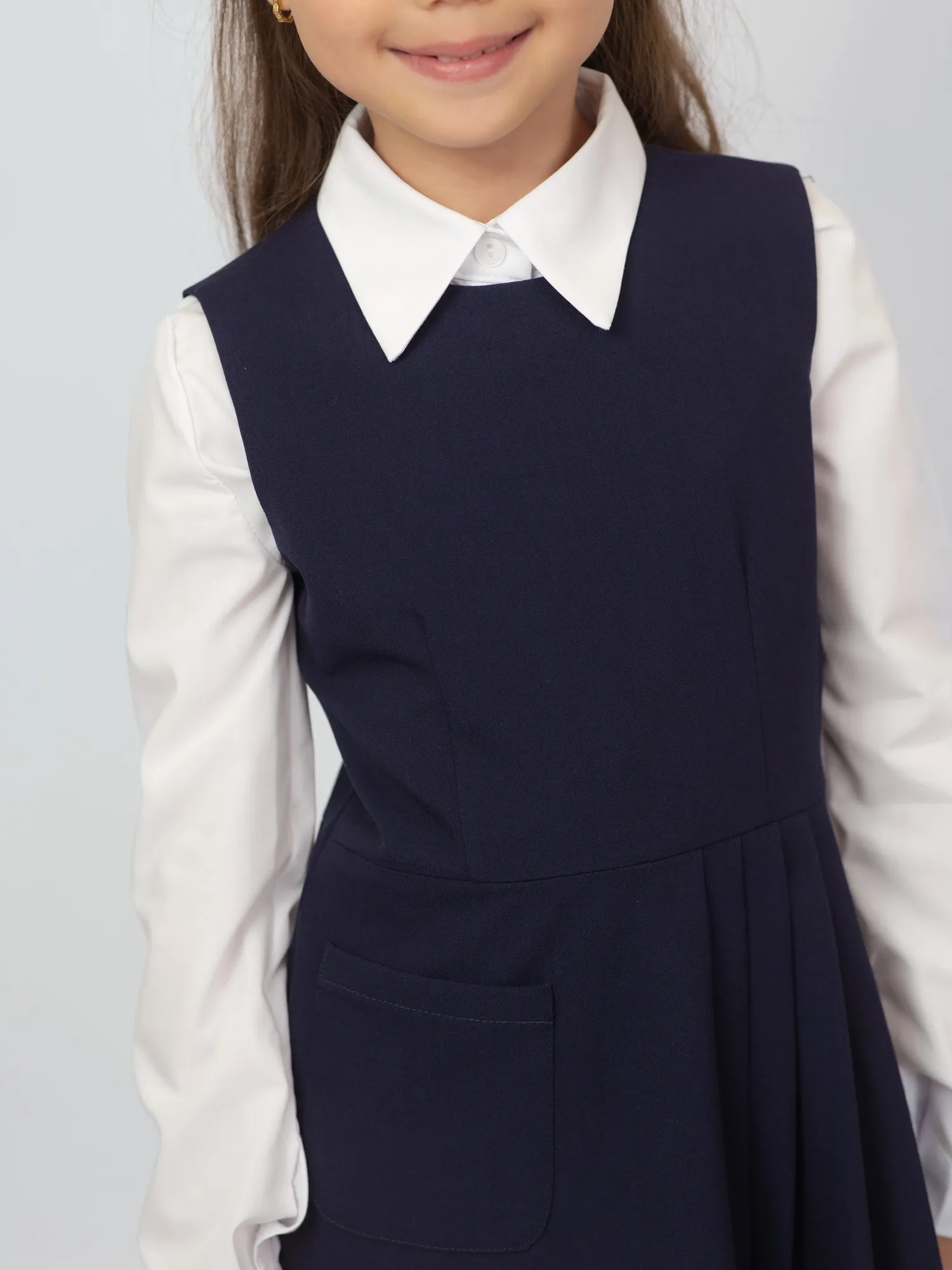 Особый акцент — нежные оборки на плечах, которые добавляют образу изящности и делают модель более нарядной. Сарафан легко сочетается с блузками и водолазками, подходя как для повседневной носки, так и для торжественных школьных мероприятий