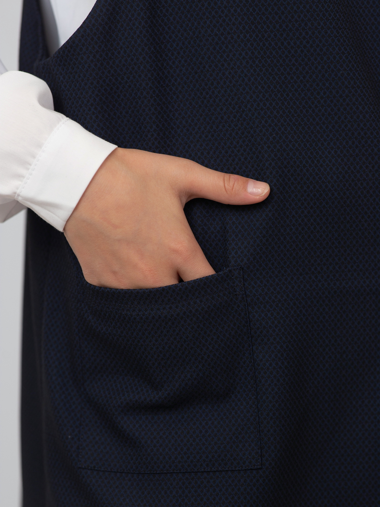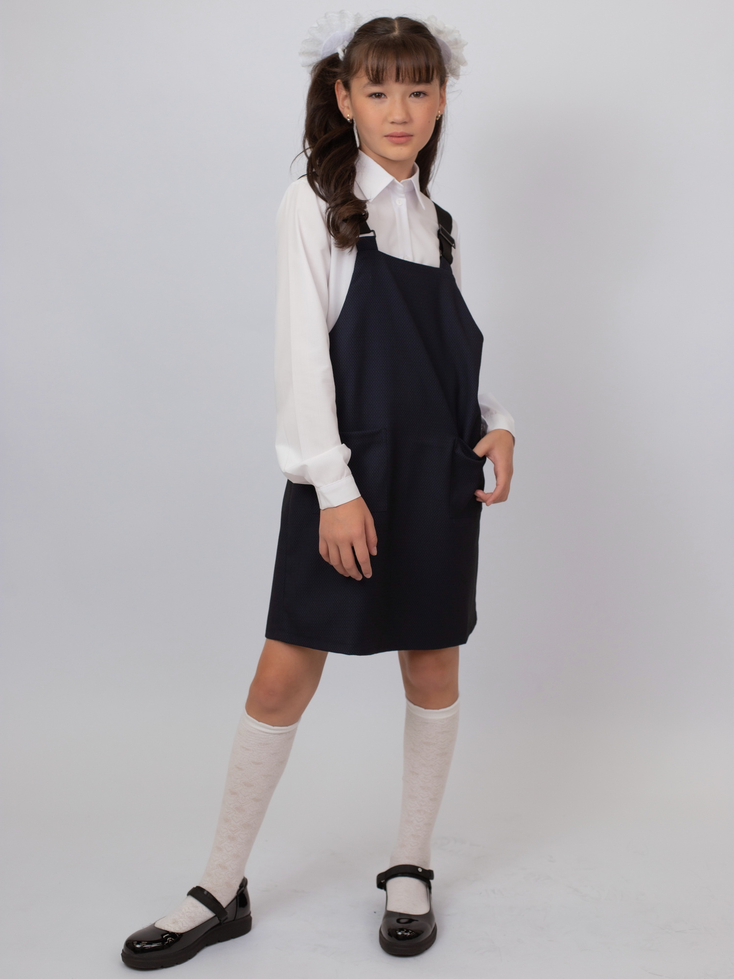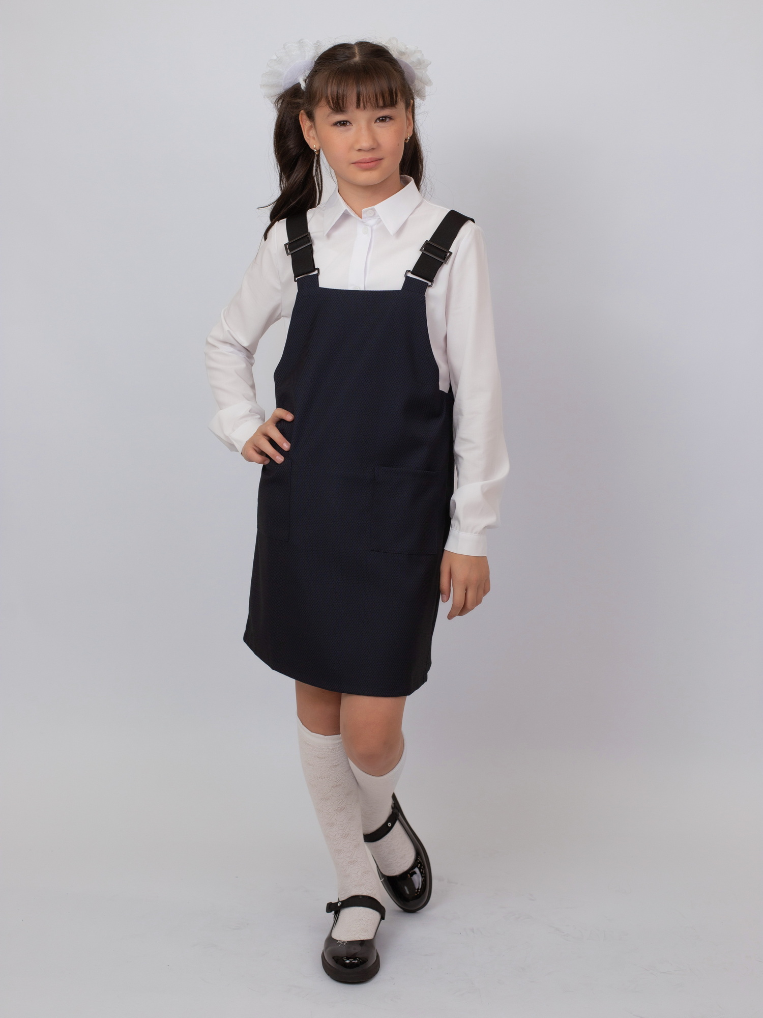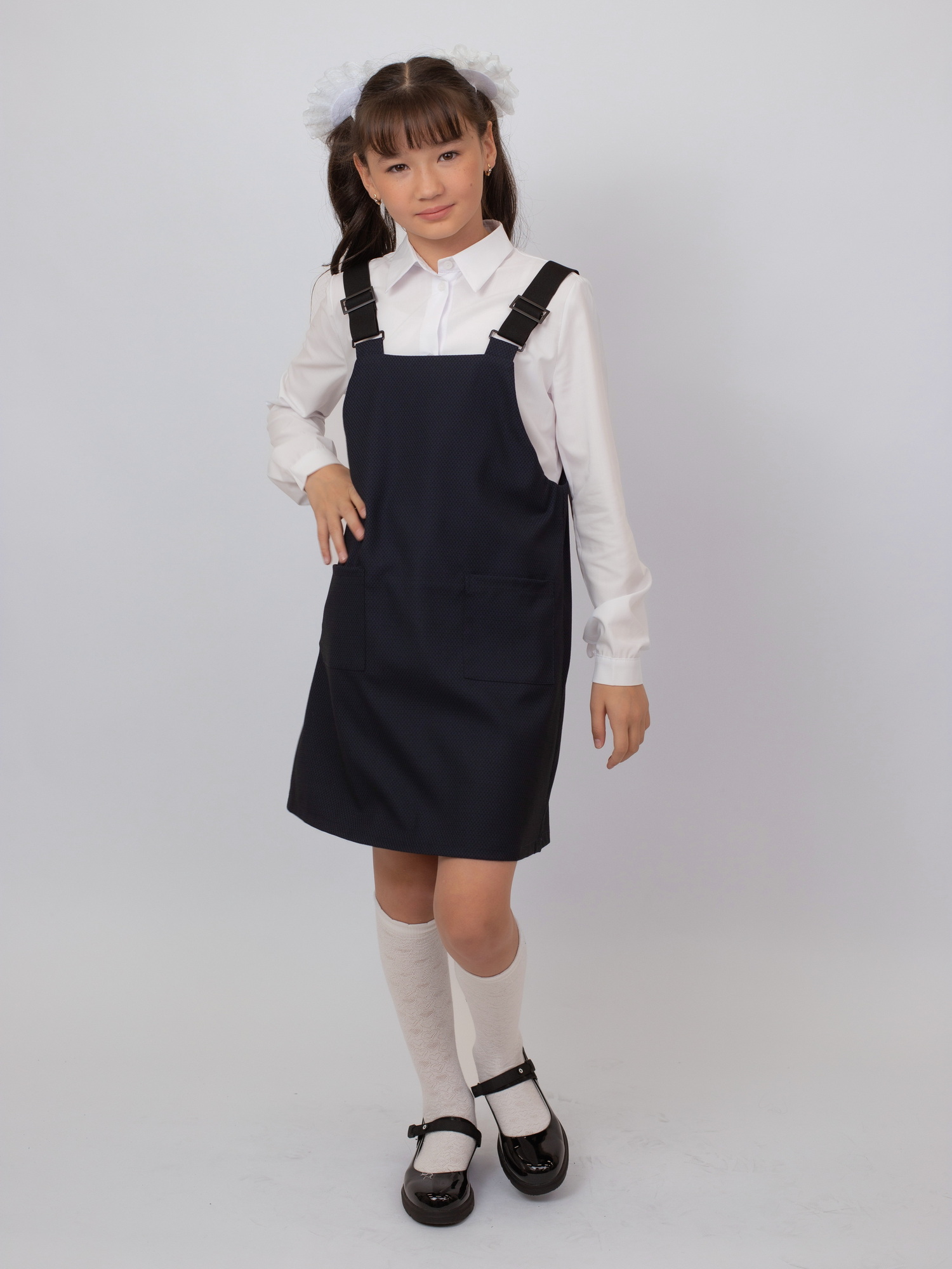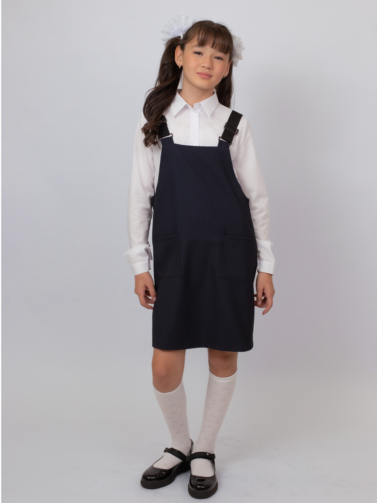 Удобный и практичный школьный сарафан из ткани 68% полиэстер, 28% вискоза, 4% спандекс — не мнётся, приятен к телу и немного тянется. Модель с широкими эластичными лямками, которые хорошо держатся и не сковывают движения. Отличный выбор для школьной формы на каждый день.