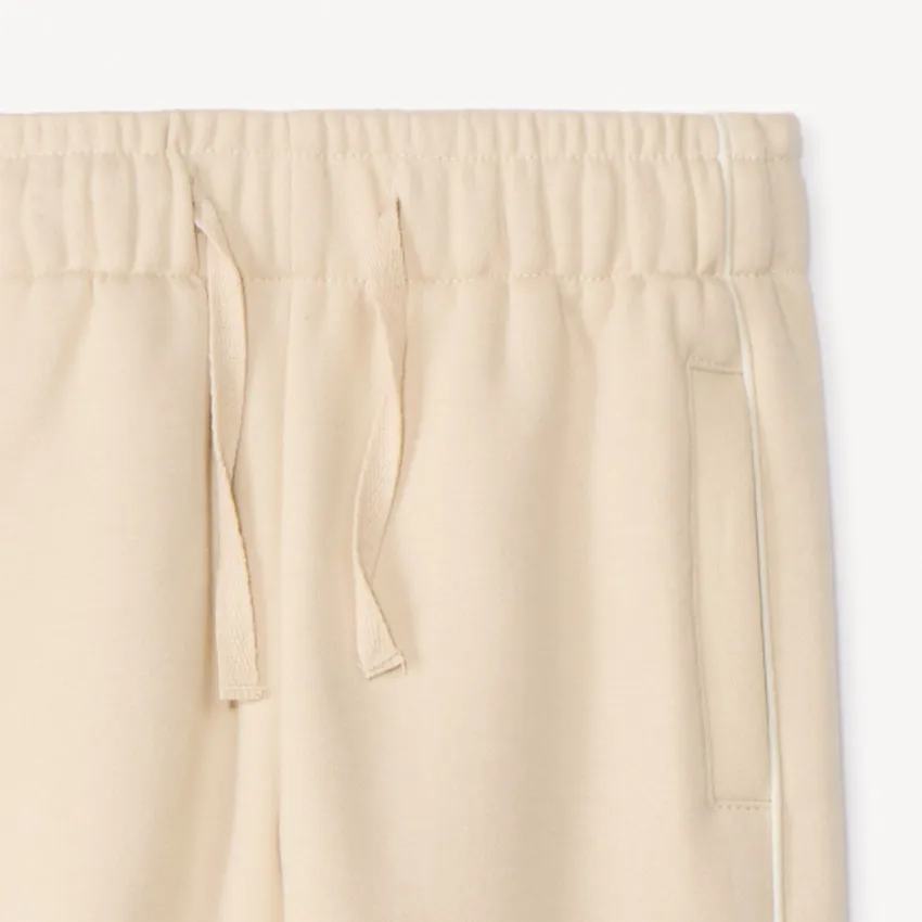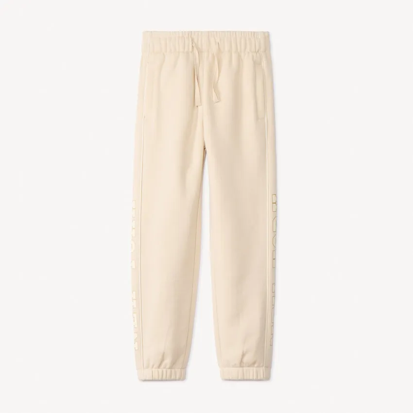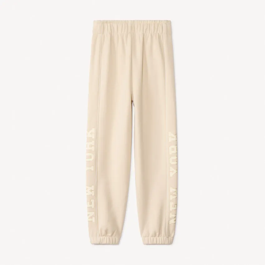 Спортивные брюки из мягкого футера. Модель с удобной эластичной талией и шнурком в тон для комфортной посадки. Спереди — два кармана реглан. По бокам проходит контрастная полоска, а на каждой штанине размещена надпись New York с блёстками. Эластичные манжеты внизу обеспечивают удобство и сохраняют форму.