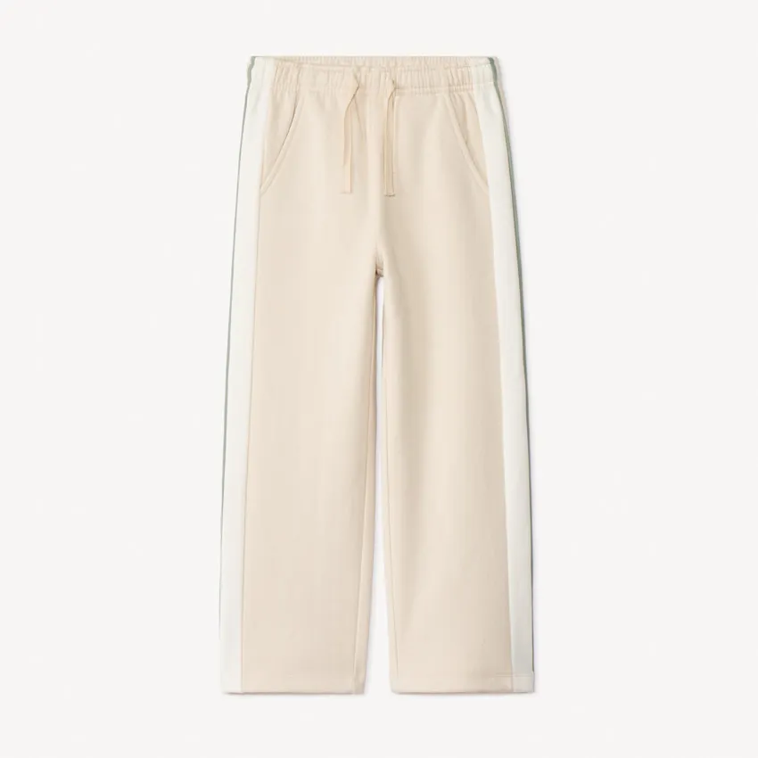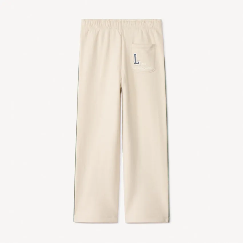 Широкие брюки-джоггеры из мягкого футера бежевого цвета. Удобная эластичная талия со шнурком в тон обеспечивает комфортную посадку. Спереди — два кармана, по бокам проходит контрастная полоса. Сзади — накладной карман с контрастной вышитой буквой. Идеальны для повседневного стиля и активного отдыха.