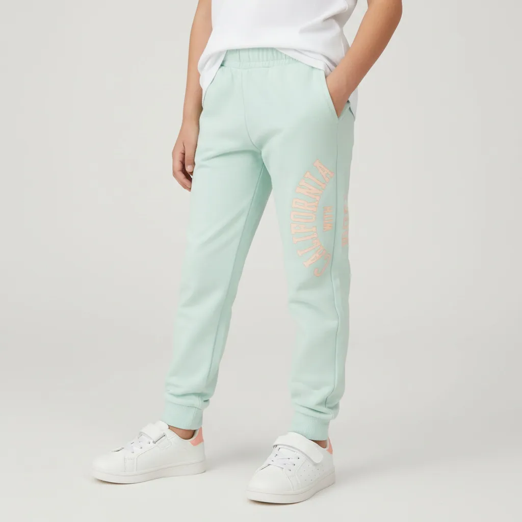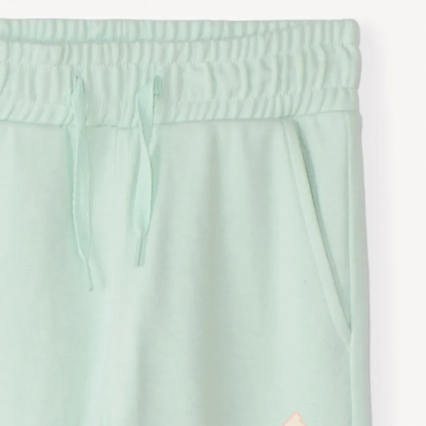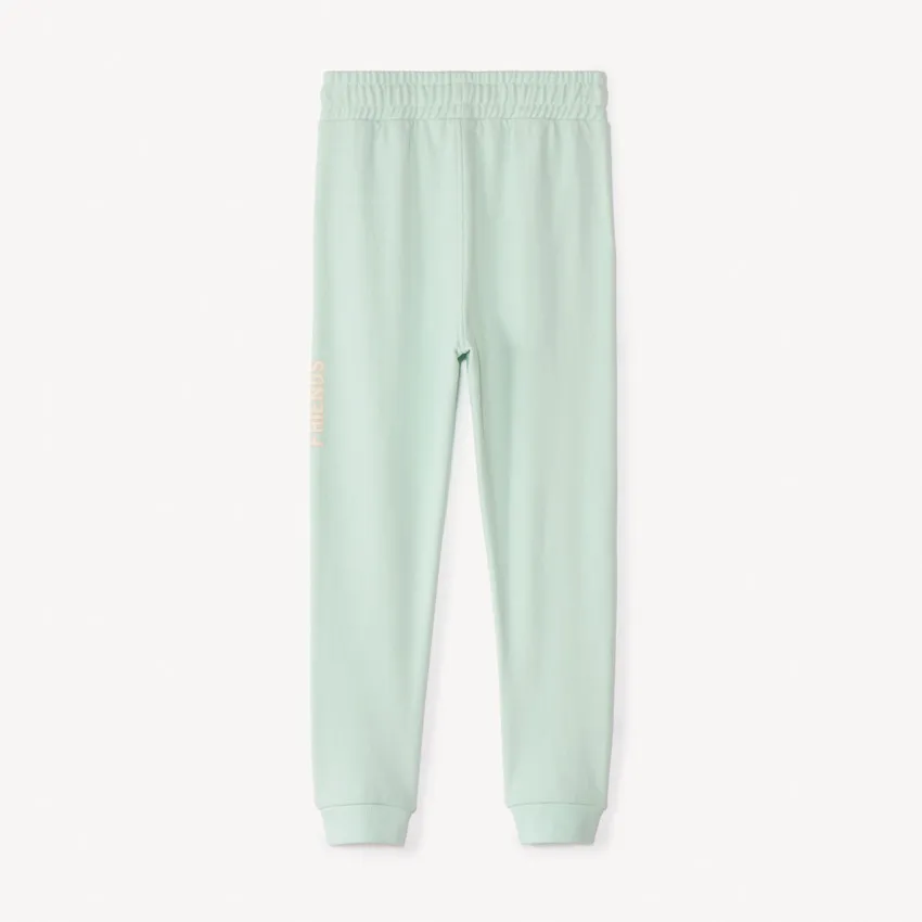 Спортивные брюки из мягкого футера для девочек. Брюки прямого кроя с манжетами. Эластичный пояс со шнурком удобно регулируется. Боковые карманы. Модель декорирована надписью.