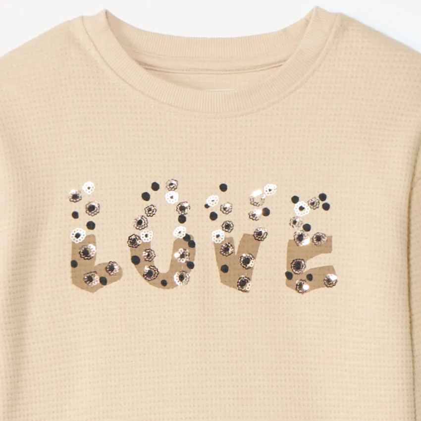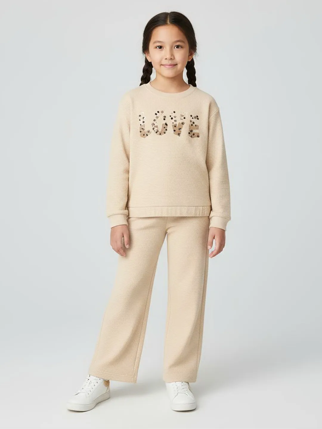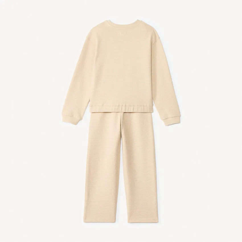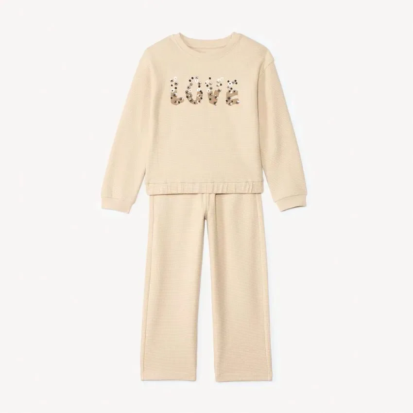 Спортивный комплект из двух предметов выполнен из трикотажа с фактурой «пчелиные соты» и представлен в разных цветах. Свитшот свободного кроя с круглым ребристым вырезом и декоративным принтом спереди дополнен эластичным низом, опущенной линией плеча и длинными рукавами с манжетами. Брюки с широкими штанинами имеют эластичный ребристый пояс и боковые прорезные карманы.