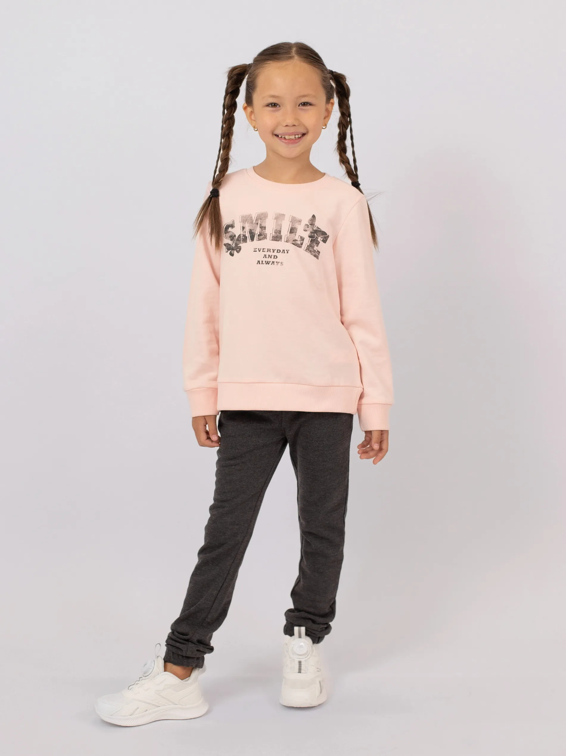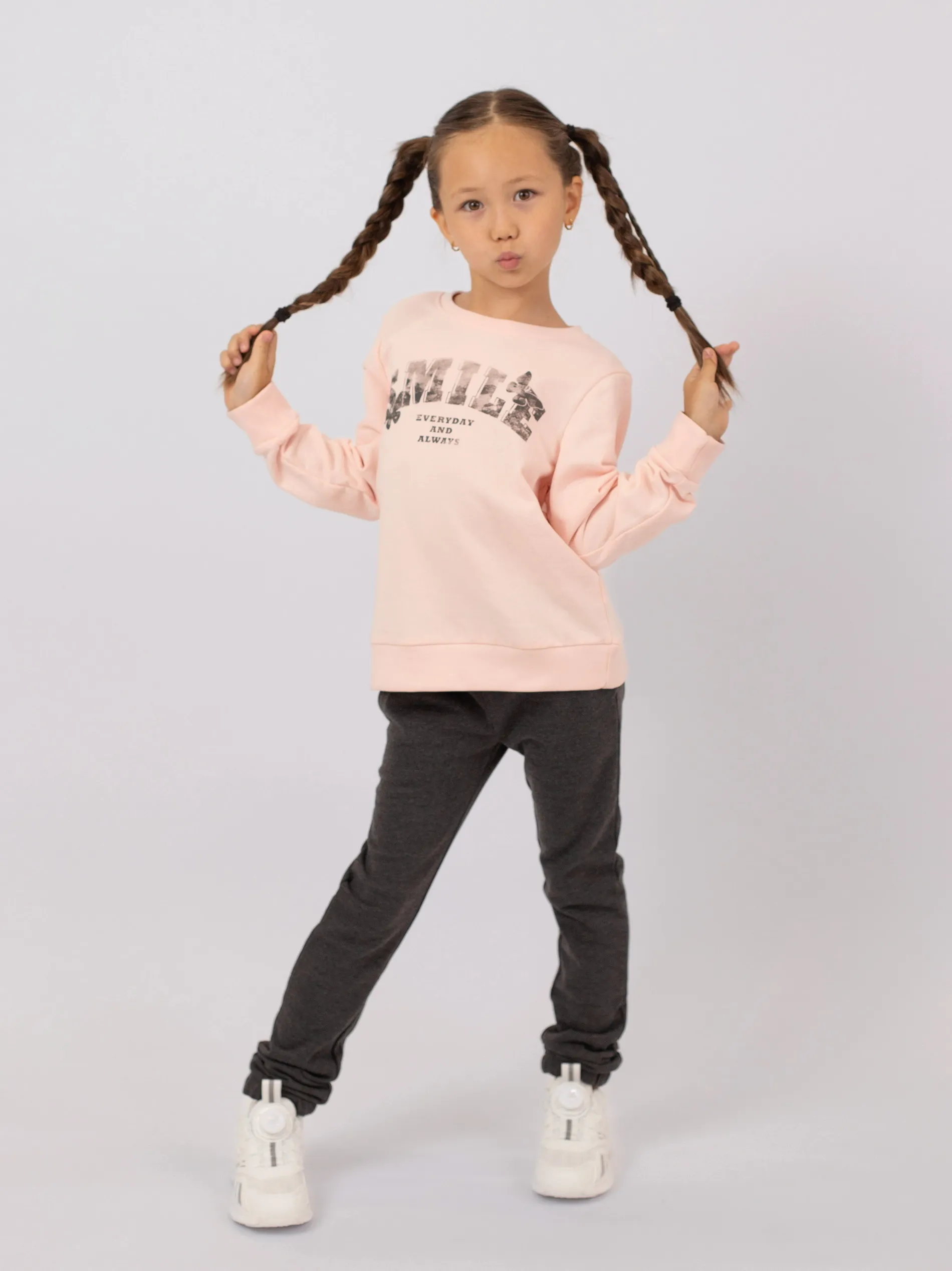 Уютный и практичный спортивный костюм из флиса для девочки — идеальный вариант для прохладной погоды. В комплект входят толстовка с длинным рукавом и брюки.