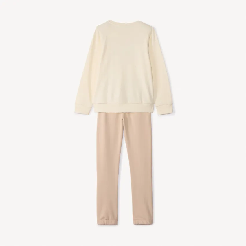 Спортивный костюм из флиса для девочки — тёплый и комфортный вариант для прохладной погоды. Свитшот с манжетами хорошо держит форму, а декоративный принт с блёстками по центру придаёт образу стильный акцент. Спортивные брюки с регулируемым шнурком обеспечивают удобную посадку и свободу движений. Подходит для прогулок, отдыха и повседневной носки.
