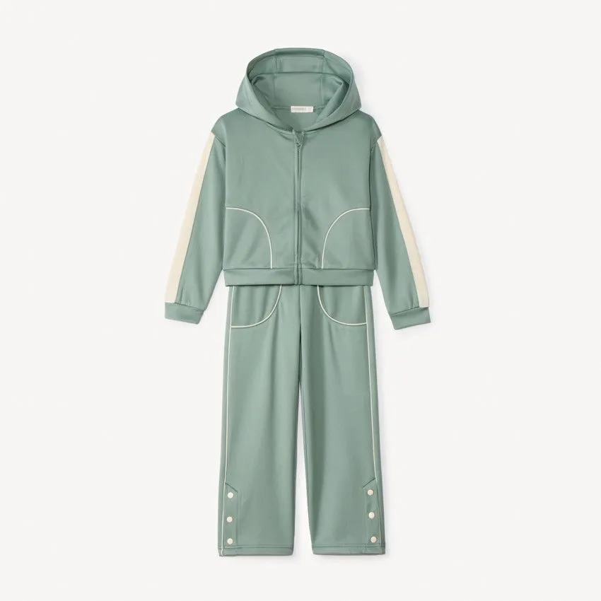 Брюки украшены контрастной полоской по бокам, а внизу штанин расположены кнопки с разрезами, придающие модели современный и динамичный вид. Материал с составом 94% полиэстер и 6% эластан отличается эластичностью, износостойкостью и хорошо сохраняет форму. Костюм отлично подойдёт для прогулок, спорта и повседневной носки.