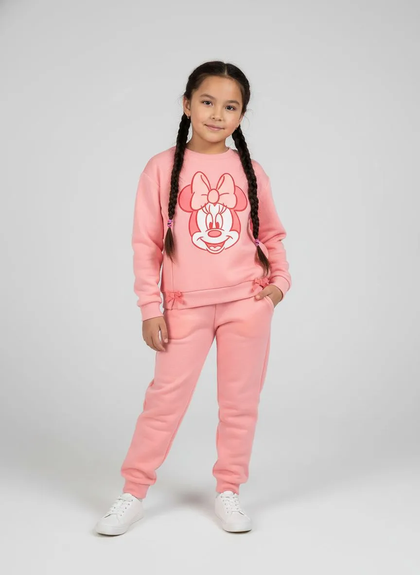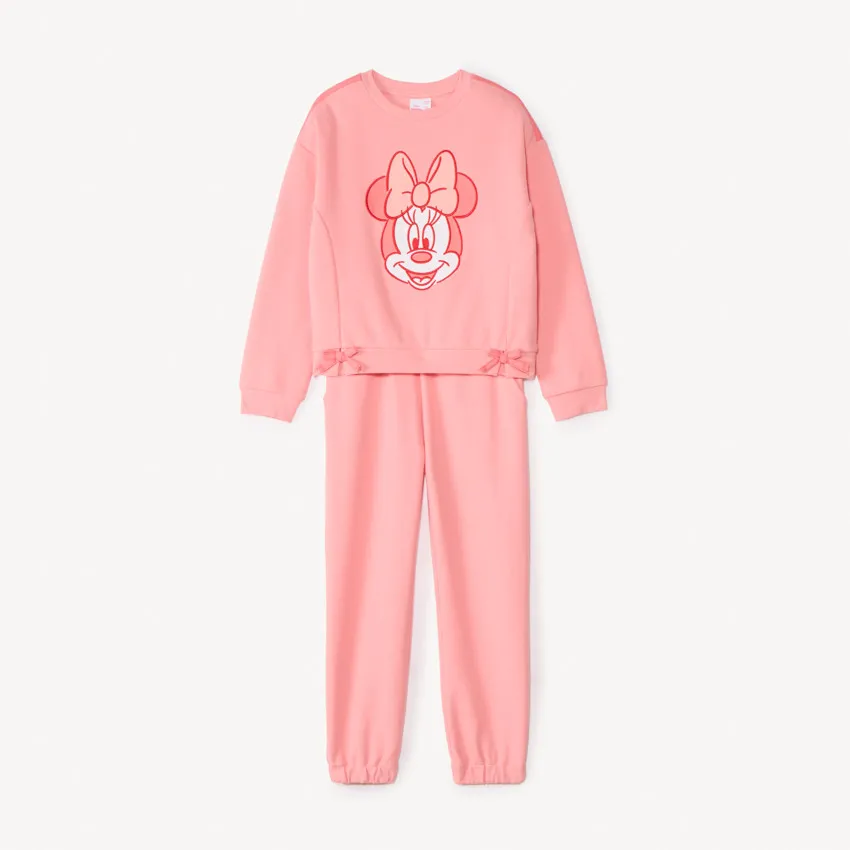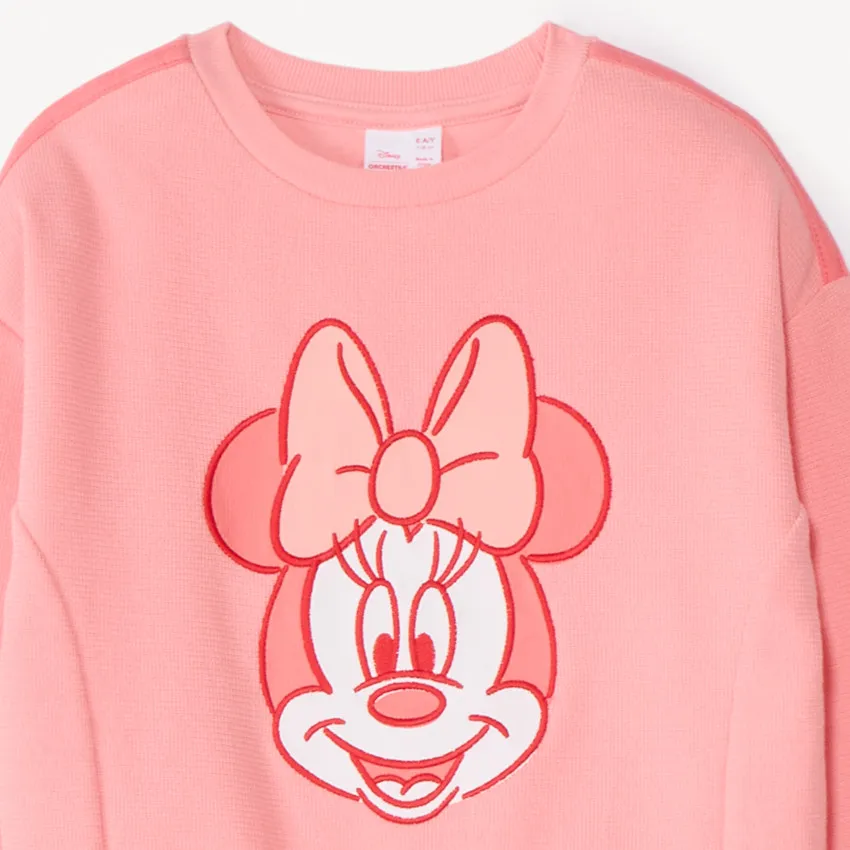 Свитшот свободного кроя украшен принтом и вышивкой с Минни по центру. Объёмные рукава, спущенные плечи с контрастной вставкой и округлый низ с декоративными узелками создают оригинальный и современный силуэт. Круглый вырез, манжеты и нижний край выполнены из эластичной резинки для удобной посадки.