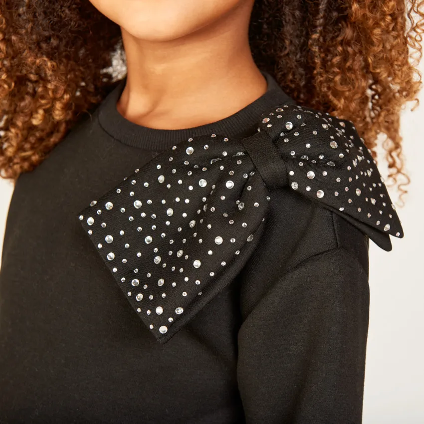 Свитшот из мягкого флиса для девочки — уютная и стильная модель на каждый день. Украшен крупным бантом из страз на плече, который придаёт образу нарядный и женственный акцент. Ткань с высоким содержанием вискозы приятна к телу, а добавление эластана обеспечивает комфорт и свободу движений.