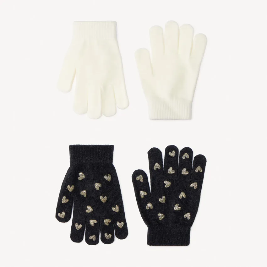 Набор из двух пар вязаных перчаток с эластичными манжетами. В комплект входит одна однотонная модель и одна с принтом в виде сердечек из фольги. Цвета варьируются в зависимости от модели.