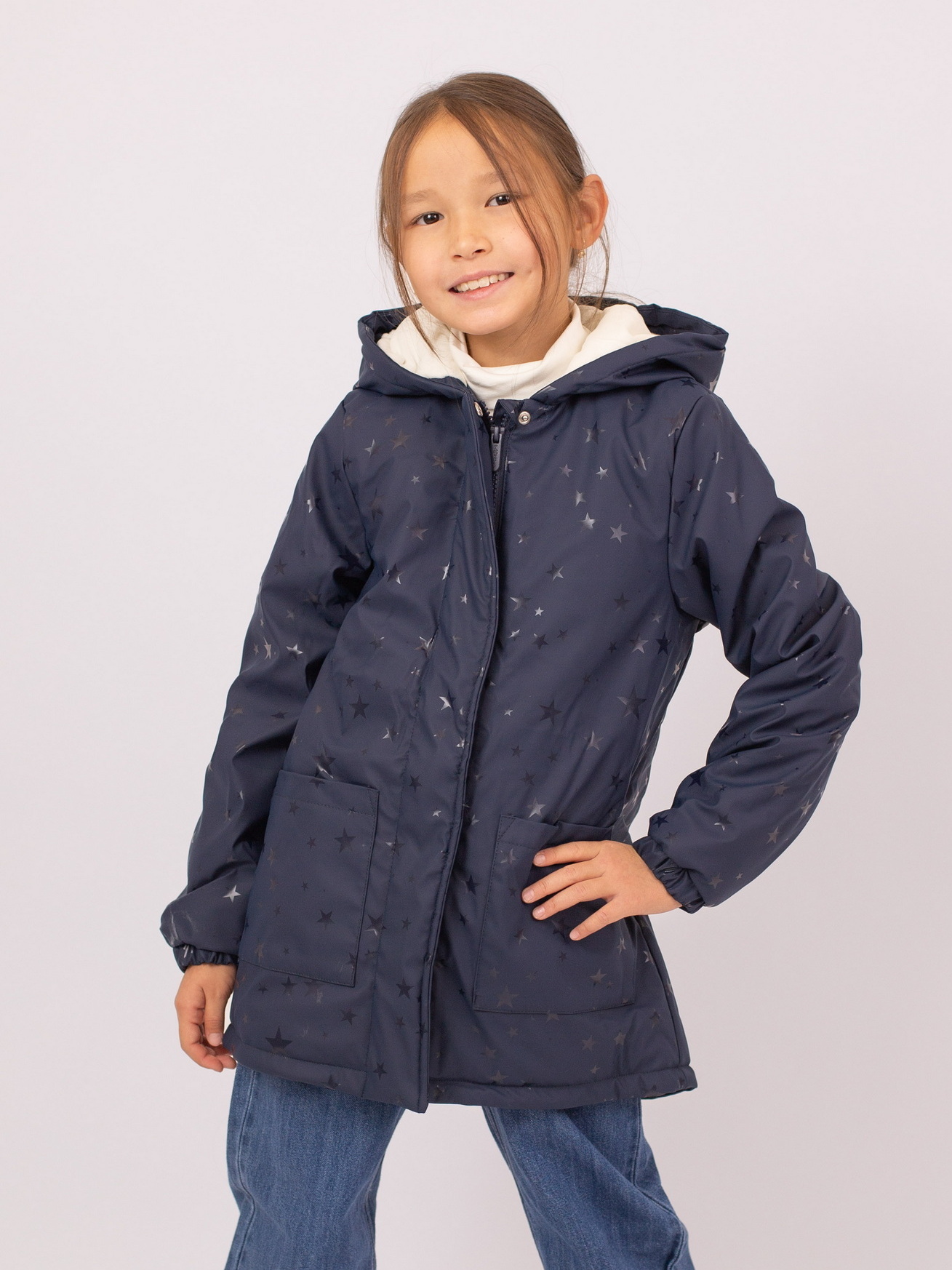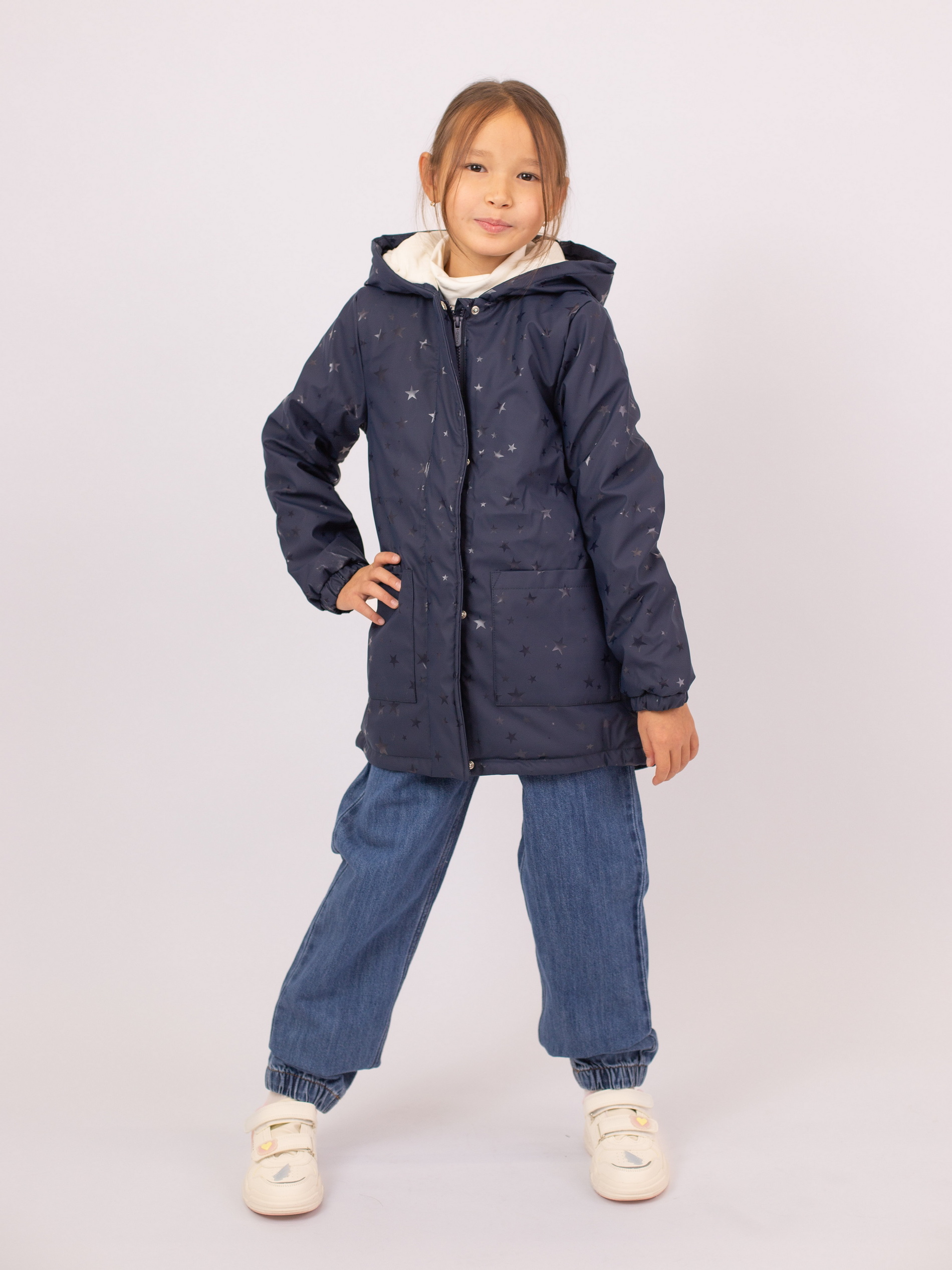 Детский плащ выполнен из водоотталкивающего материала. Внутри — мягкая и тёплая подкладка из шерпы. Тёмно-синий цвет с едва заметным принтом звёзд. Капюшон несъёмный, застёжка на молнию с планкой на кнопках. Спереди — два кармана, манжеты на резинке. Внутри есть бирка для имени. Удобный и тёплый вариант на прохладную погоду.