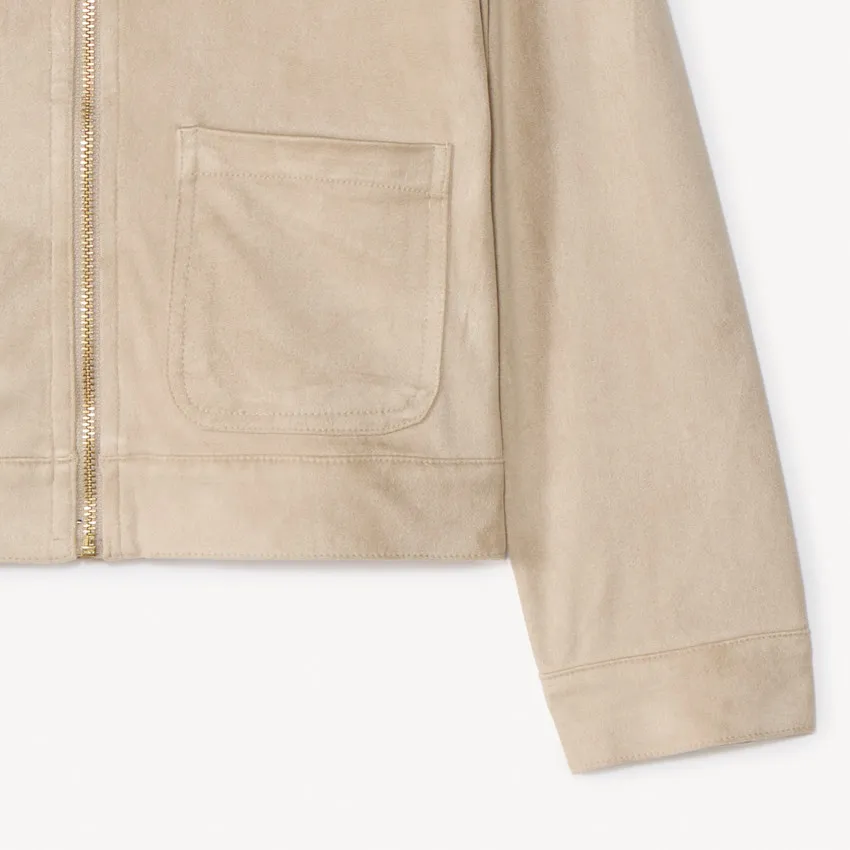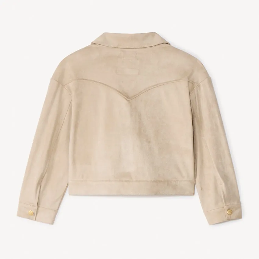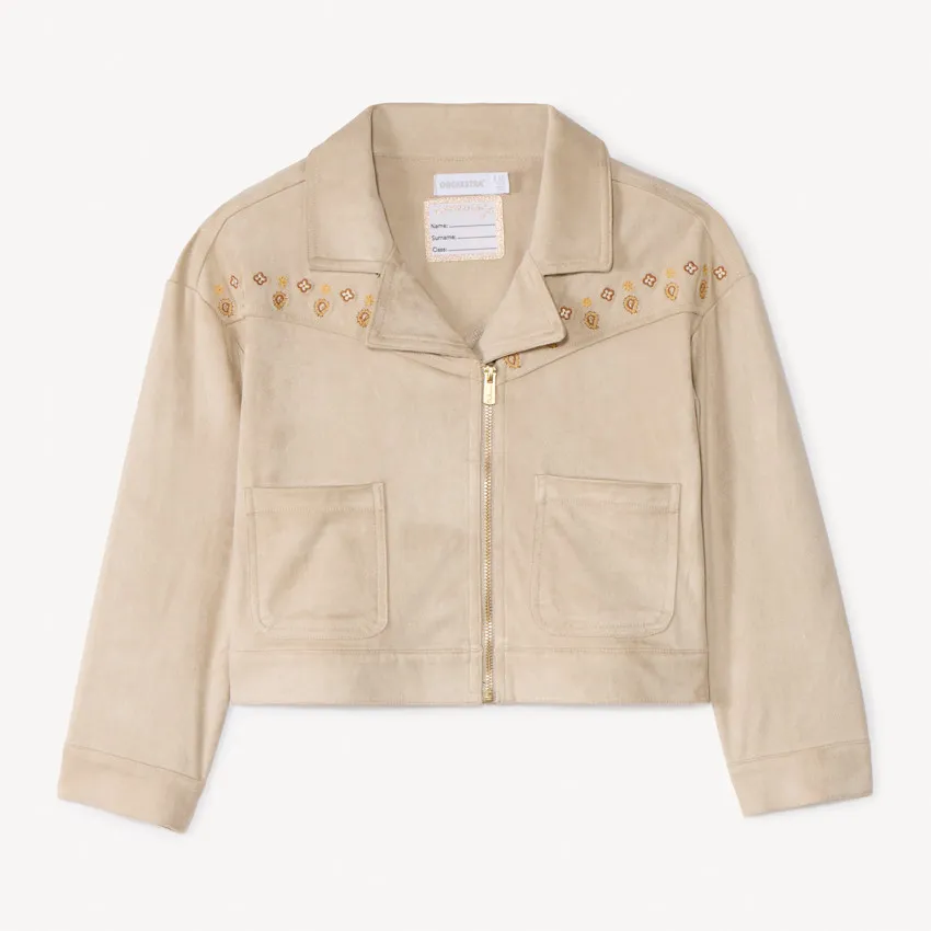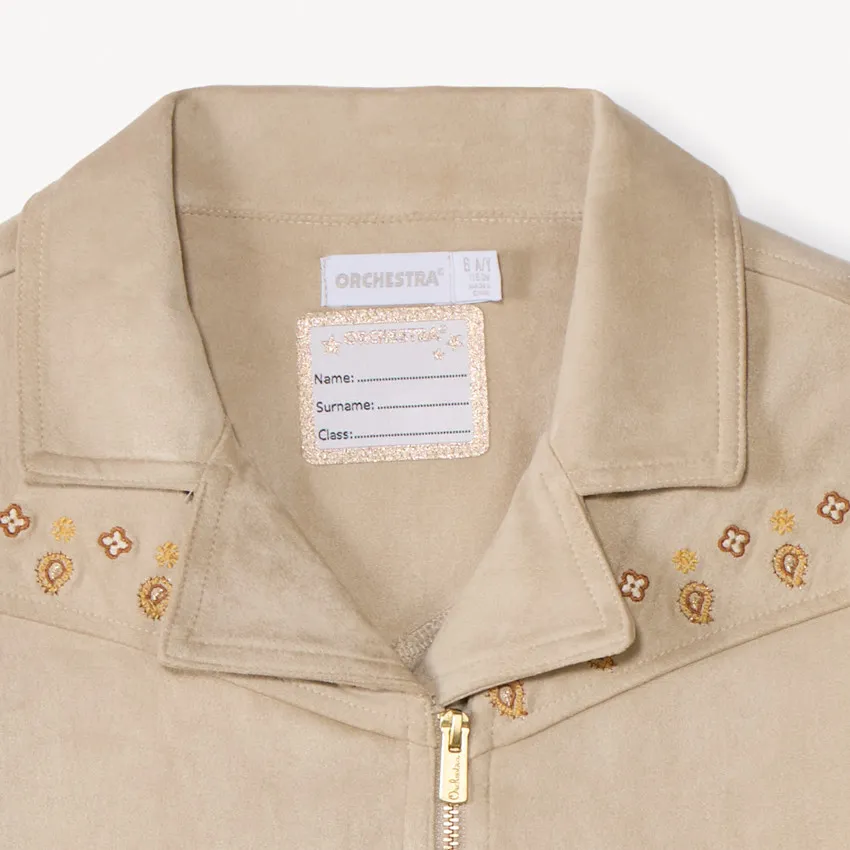 Стильный жакет ORCHESTRA в стиле косухи — отличный вариант для модных и удобных повседневных образов. Модель выполнена из мягкой ткани под замшу в универсальном бежевом цвете.