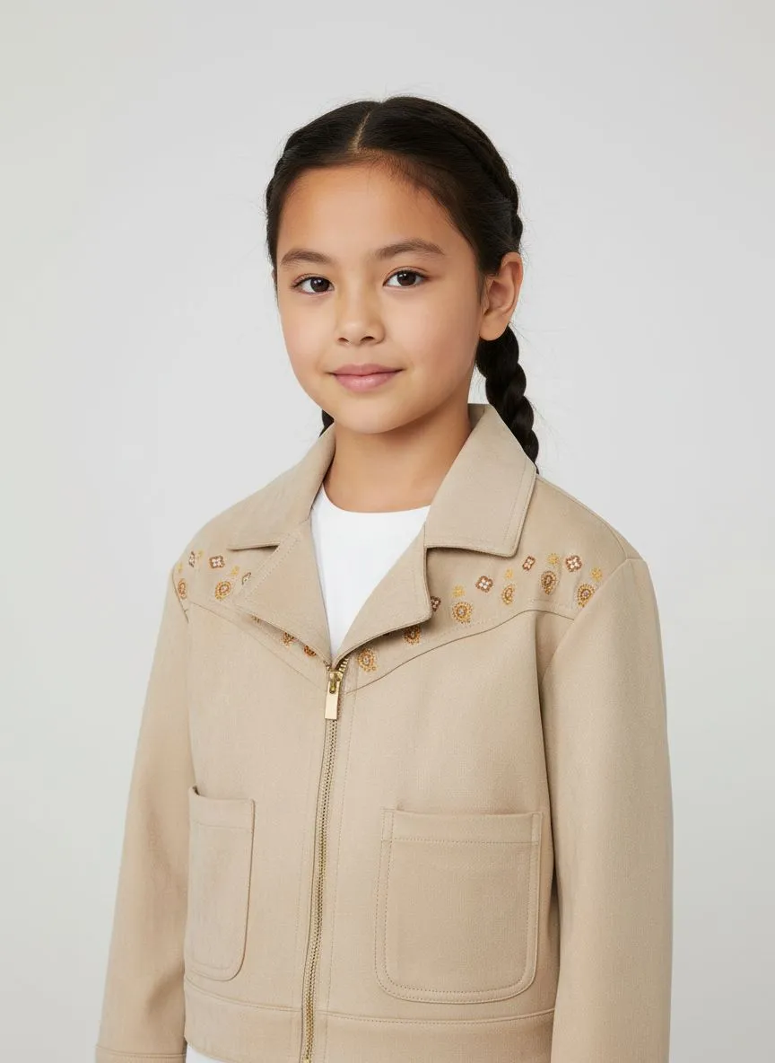 Жакет имеет воротник с острыми уголками и застёжку на золотистую металлическую молнию. Спереди расположены удобные карманы, а верх украшен красивой вышивкой в стиле пейсли. На спинке выполнен декоративный шов в форме сердца, который добавляет модели оригинальности. Рукава дополнены манжетами на кнопках, а внутри воротника предусмотрена именная бирка.